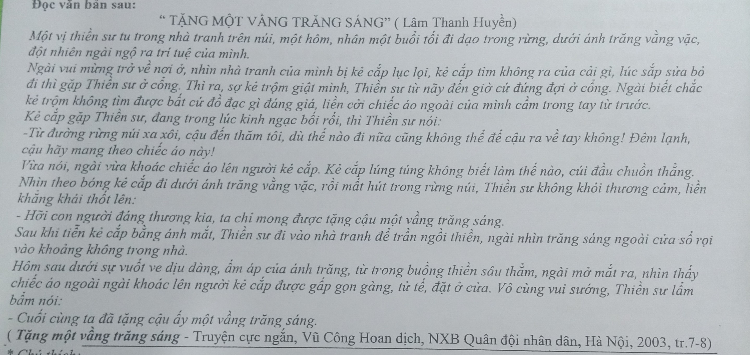 Chii Quyình Truyện "Tặng một vầng trăng sáng" của Lâm Thanh Huyền, dịch bởi Vũ Công Hoan, kể về một vị thiền sư tu trong nhà tranh trên núi. Một buổi tối, khi đi dạo trong rừng dưới ánh trăng, ngài nhận ra trí tuệ của mình. Vui mừng trở về nhà, ngài thấy nhà tranh của mình bị kẻ cắp lục lọi nhưng không tìm được gì đáng giá. Khi ngài chuẩn bị rời đi, ngài gặp Thiền sư ở cổng. Thiền sư đã đứng đợi ở đó để ngăn chặn kẻ trộm. Ngài biết rằng kẻ trộm không tìm được gì, liền cởi chiếc áo ngoài của mình và đưa cho kẻ trộm. Kẻ trộm lúng túng không biết làm gì, cuối cùng cúi đầu đi đi. Sau khi tiễn kẻ trộm, Thiền sư đi vào nhà tranh để thiền. Hôm sau, ngài mở mắt và thấy chiếc áo ngoài ngài đã được gấp gọn gàng và đặt ở cửa. Ngài vui mừng và nói rằng cuối cùng đã tặng kẻ trộm một vầng trăng sáng.