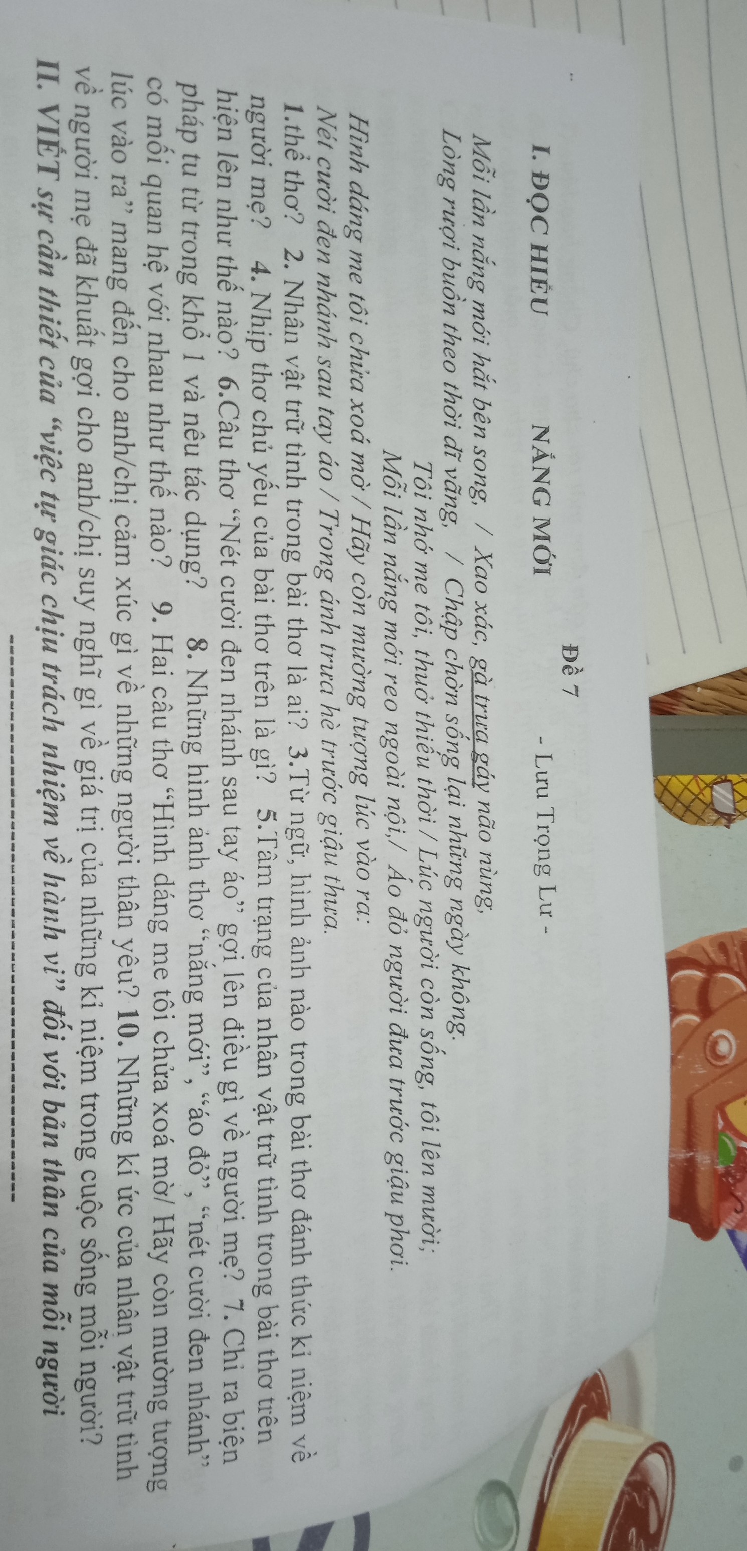 Những câu thơ miêu tả hình ảnh người mẹ: “Mỗi lần nắng mới hắt bên song”, “Áo đỏ Người đưa trước giậu phơi”, “Hình dáng Me tôi chửa xóa mờ”, “Nét cười đen nhánh sau tay áo”.