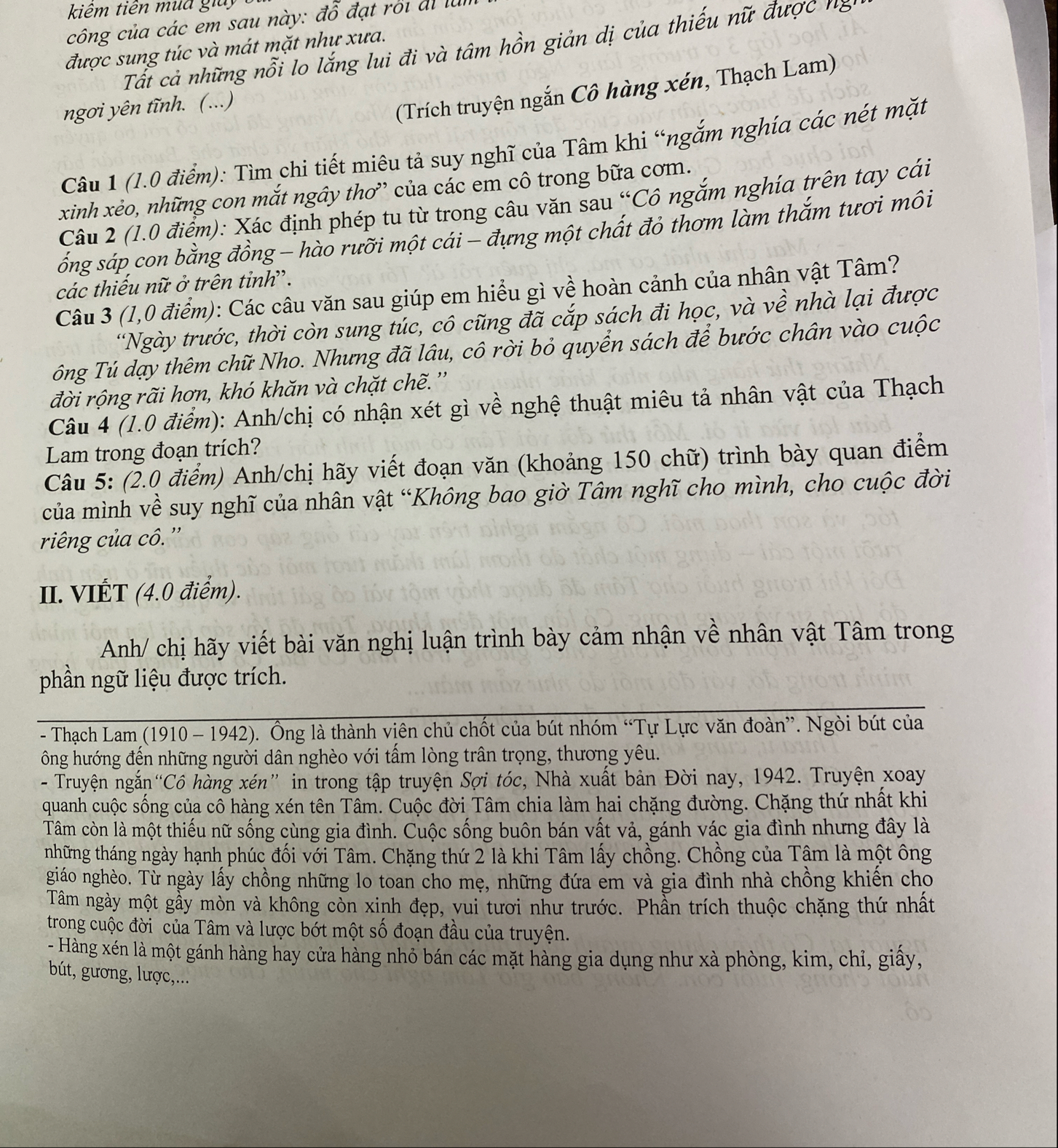 Câu 4: Một truyện ngắn đầy chất thơ, là những trang viết về hơi thở của cuộc sống đời thường, thấm đượm cảm xúc. Đặt mình vào nhân vật chính, Thạch Lam cảm nhận được những vất vả khổ cực, thiếu thốn vật chất của cô hàng xén. Cuộc đời cô cứ thế trôi đi với những nỗi lo toan đè nặng lên vai là những gánh hàng xén, lo cho em, cho mẹ , cho chồng. Cái tinh tế, nhạy cảm của Thạch Lam là ở đó, ông len lỏi vào ngõ ngách tâm hồn người, lắng nghe những vang động sâu thẳm bên trong để thông cảm đồng cảm với những thân phận khác nhau. Nếu không bằng một tấm lòng chân thành và giàu tình yêu thương liệu Thạch Lam có thể viết về những mảnh đời ấy chân thực và sinh động đến thế.