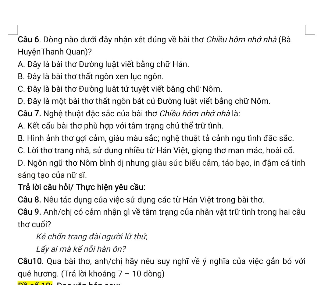 Câu 9. Nhân vật trữ tình có tâm trạng buồn lê thê, một niềm sầu thương tê tái của khách đi xa nhớ nhà, nhớ quê hương da diết. Tác giả không có ai để tâm sự, trời đất thì bao la, vắng lặng, trống trải, khiến tác giả quay về với nội tâm, với lòng buồn sẵn có của mình.