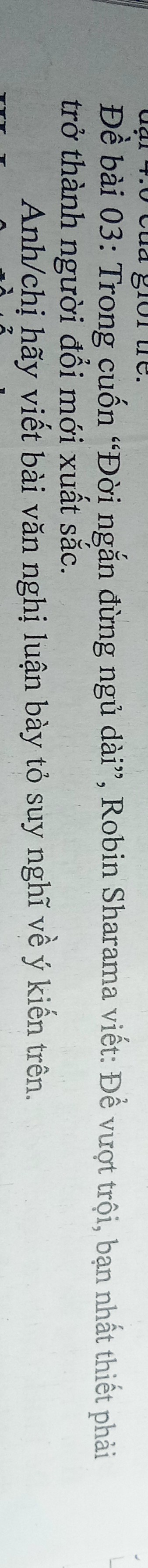 Ý kiến trong câu trích dẫn "Trong cuộc đời ngắn đừng ngủ dài, Robin Sharma viết để vượt trội bạn nhất thiết phải trở thành người đổi mới xuất sắc" chắc chắn mang một thông điệp mạnh mẽ về việc khám phá tiềm năng cá nhân và đạt được sự xuất sắc trong cuộc sống. Dưới đây là bài văn nghị luận của tôi, diễn đạt suy nghĩ về ý kiến trên.