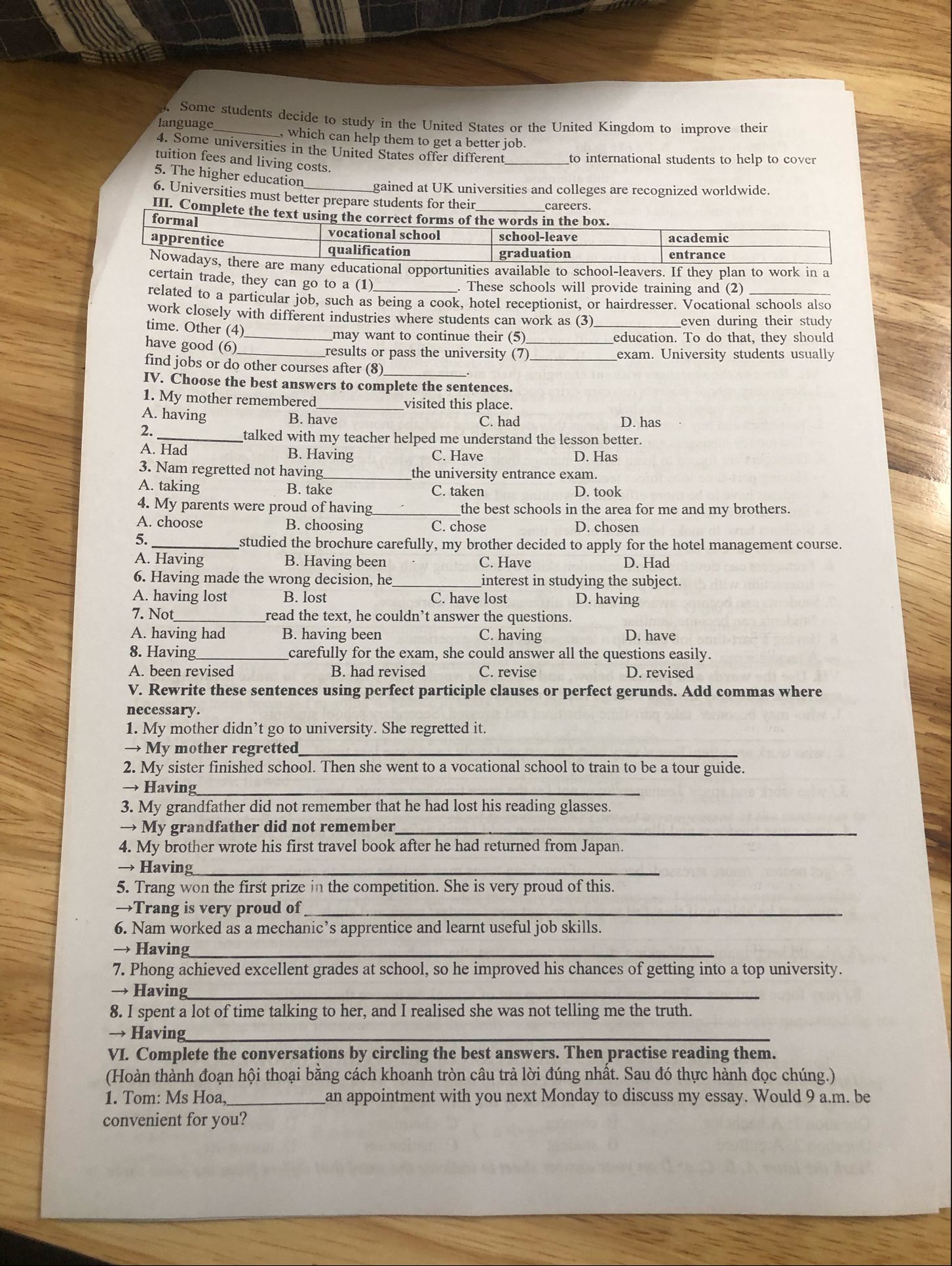 7. Phong achieved excellent grades at school, so he improved his chances of getting into a top university.