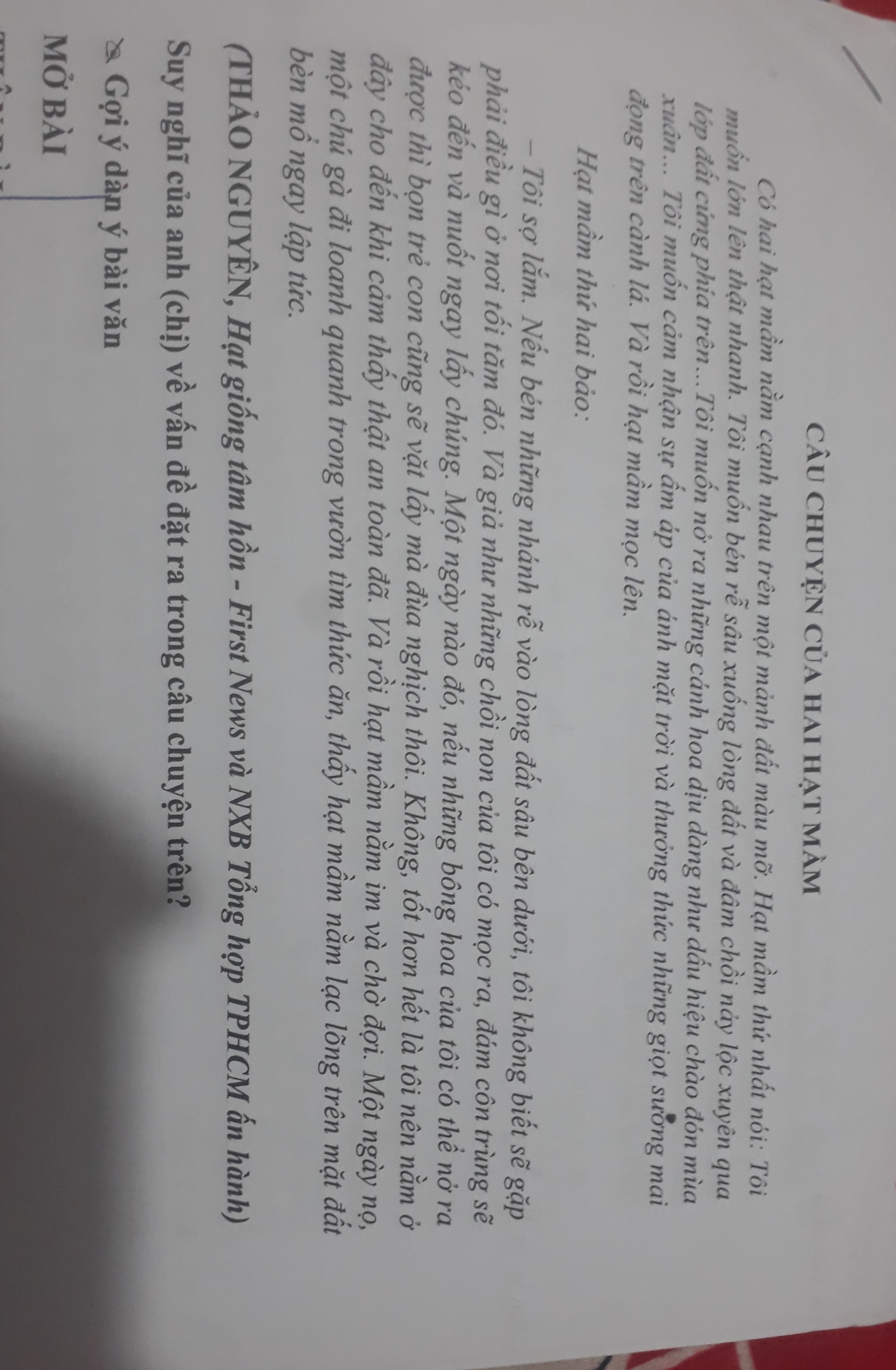 Câu chuyện kể về hai hạt mầm nằm cạnh nhau trên cùng một mảnh đất. Hạt mầm thứ nhất thì muốn vươn lên mạnh mẽ để đâm chồi, nảy lộc, những điều tốt đẹp trong tương lai, lại được hưởng ánh nắng sương mai rồi chờ những bông hoa thật đẹp. Hạt mầm thứ hai thì ngược lại bi quan, nó nghĩ đến những nguy hiểm trong tương lai rồi sợ sệt không muốn vươn lên và cuối cùng hạt mầm thứ hai bị một chú gà mổ ăn mất. Qua câu chuyện, ta có thể thấy, suy nghĩ của hạt mầm thứ nhất là suy nghĩ của lối sống tích cực, lạc quan, mạnh mẽ, sẵn sàng đối đầu với khó khăn thử thách luôn mơ ước những điều tốt đẹp trong cuộc sống. Còn hạt mầm thứ hai lại đại diện cho người có lối sống tiêu cực. Họ luôn sống bi quan, sợ sệt và đầu hàng trước những khó khăn trong cuộc sống luôn nghĩ đến những điều trở ngại, thử thách và dễ nản lòng bỏ cuộc. Câu chuyện đã để lại cho ta một triết lý, một bài học về cách sống, quan niệm sống sâu sắc. Ở đời, sống phải có ước mơ (mong muốn những điều tốt đẹp trong tương lai), dám đối đầu với khó khăn để biến ước mơ thành hiện thực và tỏa sáng. Sống không có ước mơ, hèn nhát, sợ hãi, thụ động… chỉ nhận được sự thất bại, thậm chí bị hủy diệt.