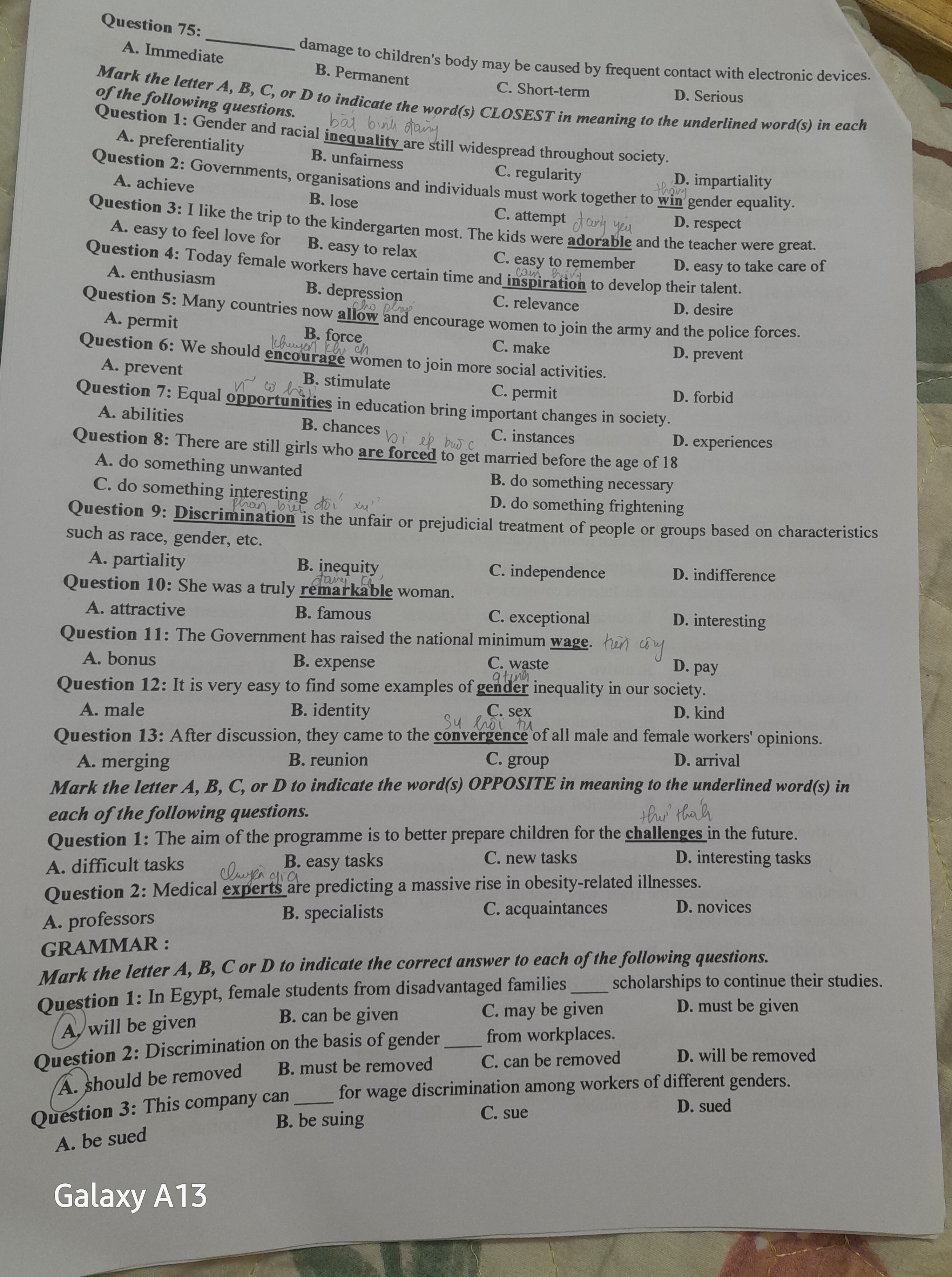 Mark the letter A, B, C, or D to indicate the word(s) CLOSEST in meaning to the underlined word(s) in each of the following questions.