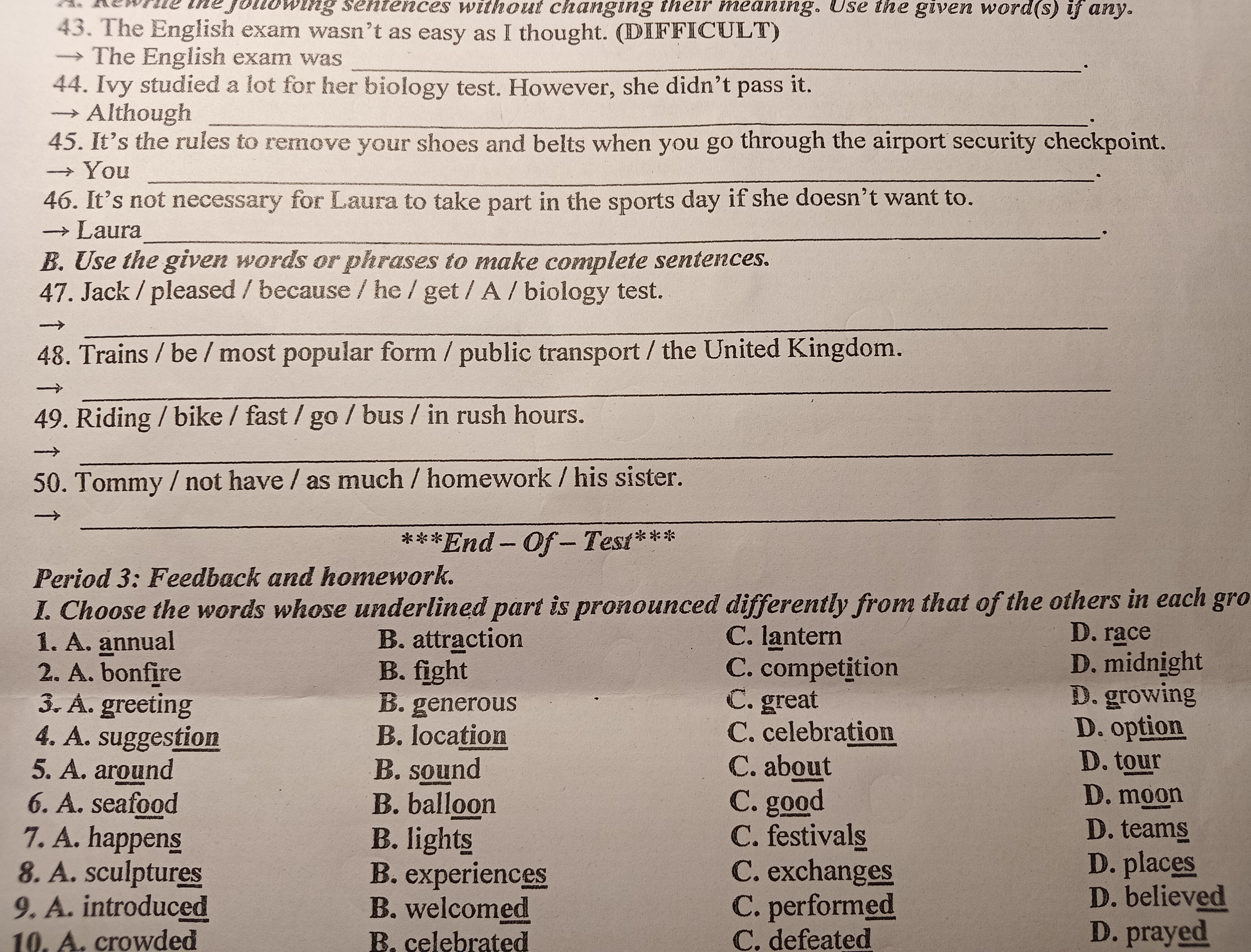 44. Although Ivy studied a lot for her biology test, she didn't pass it.