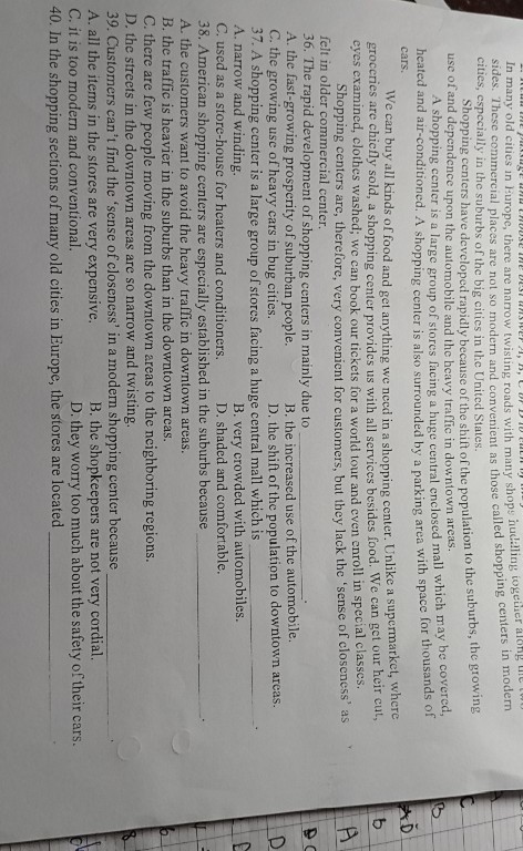39. Customers can't find the 'sense of closeness' in a modern shopping center because C. it is too modern and conventional.