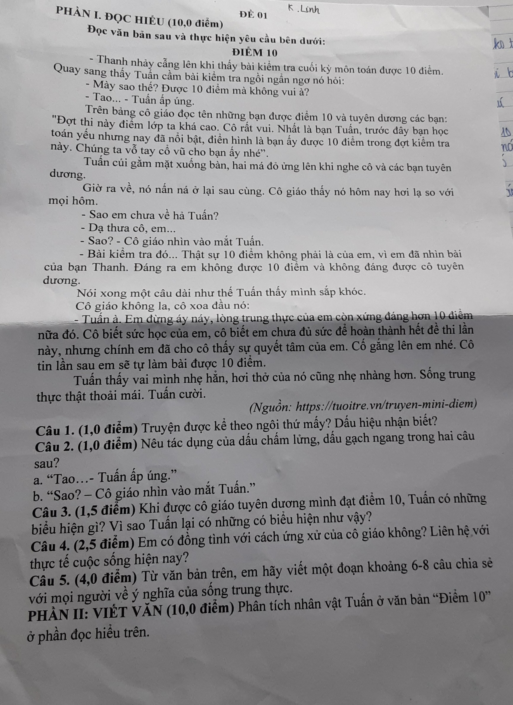 Câu 1. (1,0 điểm) Truyện được kể theo ngôi thứ ba, tác giả không xưng tôi mà gọi tên nhân vật