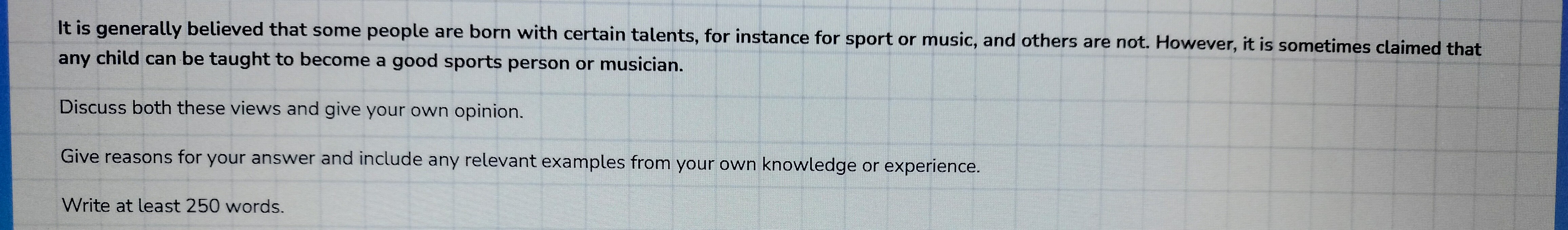 channie The statement "any child can be taught to become a good sports person or musician" is a topic that has been widely debated. In this essay, I will discuss both views and provide my own opinion on the matter. On one hand, there are those who believe that with proper training, guidance, and dedication, any child can excel in sports or music. They argue that talent is not the only factor determining success in these fields. Hard work, perseverance, and effective coaching play crucial roles in developing skills and achieving excellence. For example, many successful athletes and musicians have attributed their achievements not only to natural talent but also to years of practice and mentorship. On the other hand, some people argue that innate talent is essential for success in sports and music. They believe that no amount of training can make up for a lack of natural ability. According to this view, individuals who possess certain physical attributes or musical aptitude from a young age are more likely to succeed in these areas. For instance, professional athletes often have genetic advantages such as fast reflexes or exceptional coordination that contribute to their success. In my opinion, while talent may give some individuals a head start in sports or music, it is not the sole determinant of success. With dedication, hard work, and access to quality instruction, any child can develop their skills and achieve proficiency in these fields. Moreover, the values instilled through sportsmanship and artistic expression are beneficial for personal growth regardless of one's level of talent.