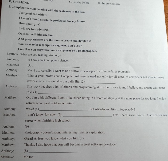 Anthony: Wow! (4) Outdoor activities are fun. But who do you like to be, exactly? Matthew: I don’t know for now. (5) I haven’t found a suitable profession for my future. I will need some pieces of advice for my career when finishing high school.