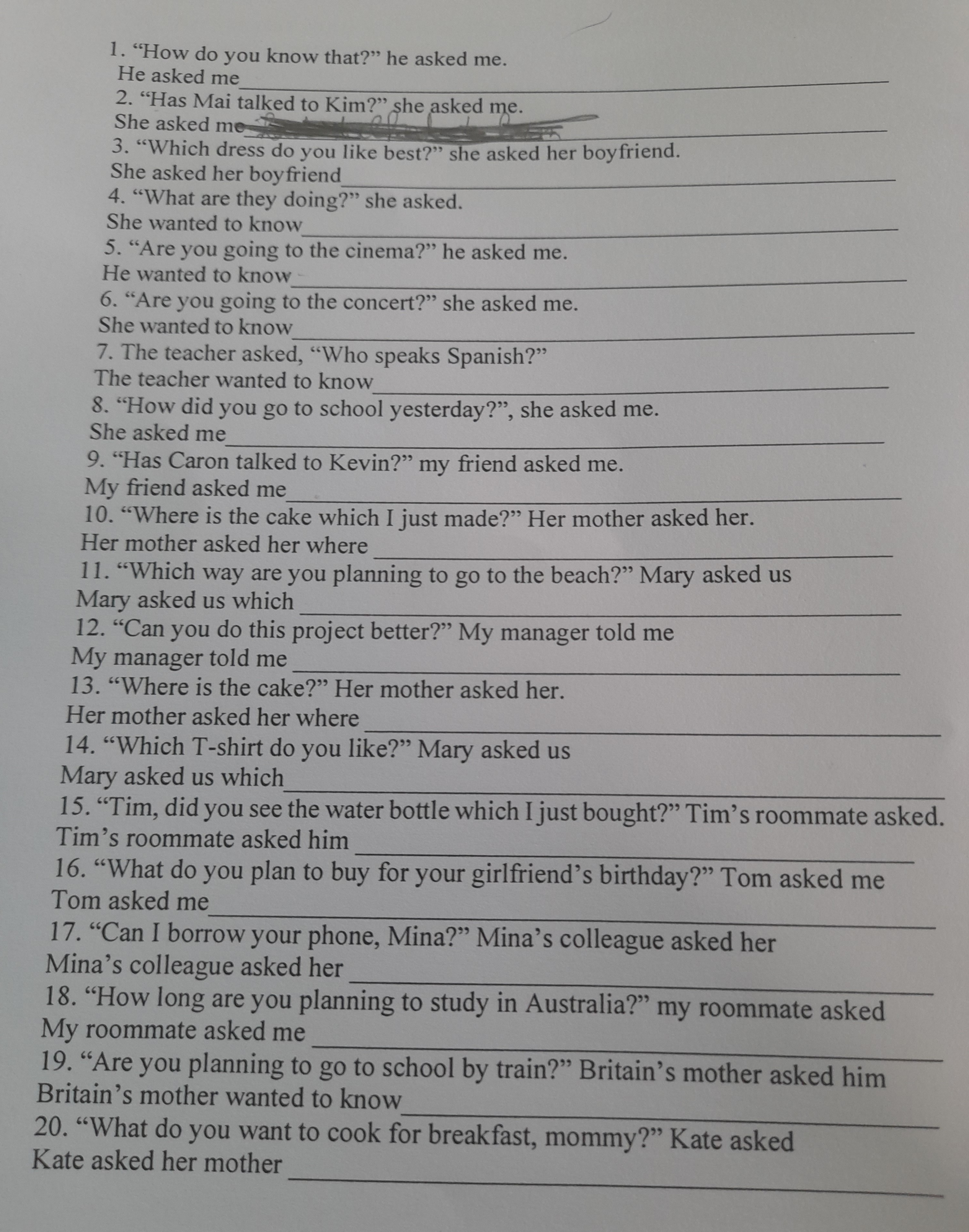 2. Cô ấy hỏi tôi Mai đã nói chuyện với Kim chưa.