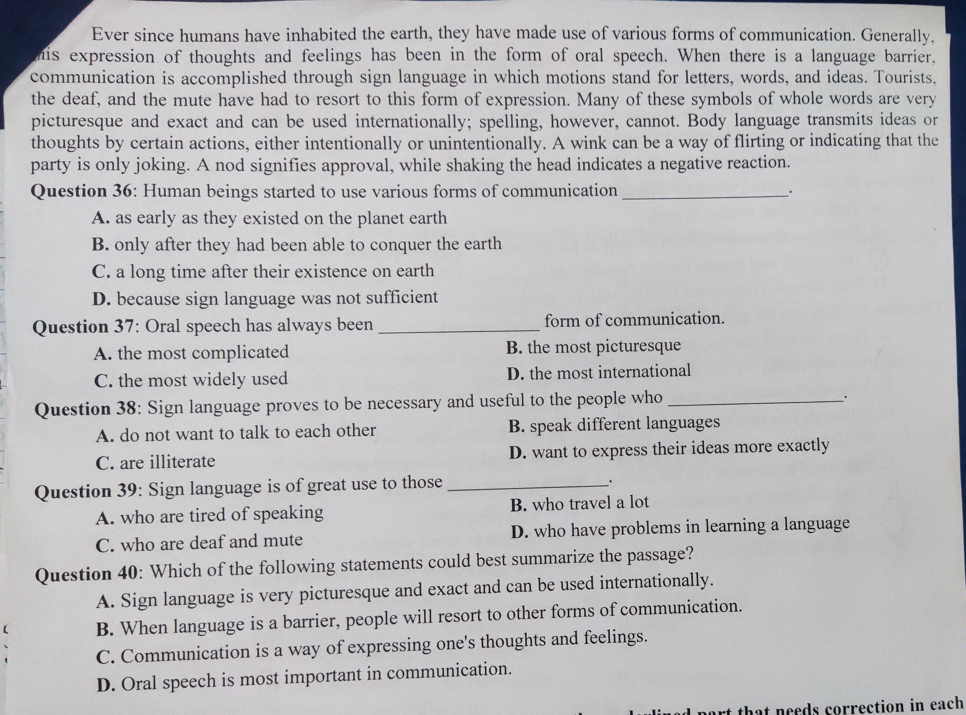 Explanation: This statement best summarizes the passage as it reflects the main idea that humans have used various forms of communication throughout history, including oral speech, sign language, and body language, especially when language barriers exist.