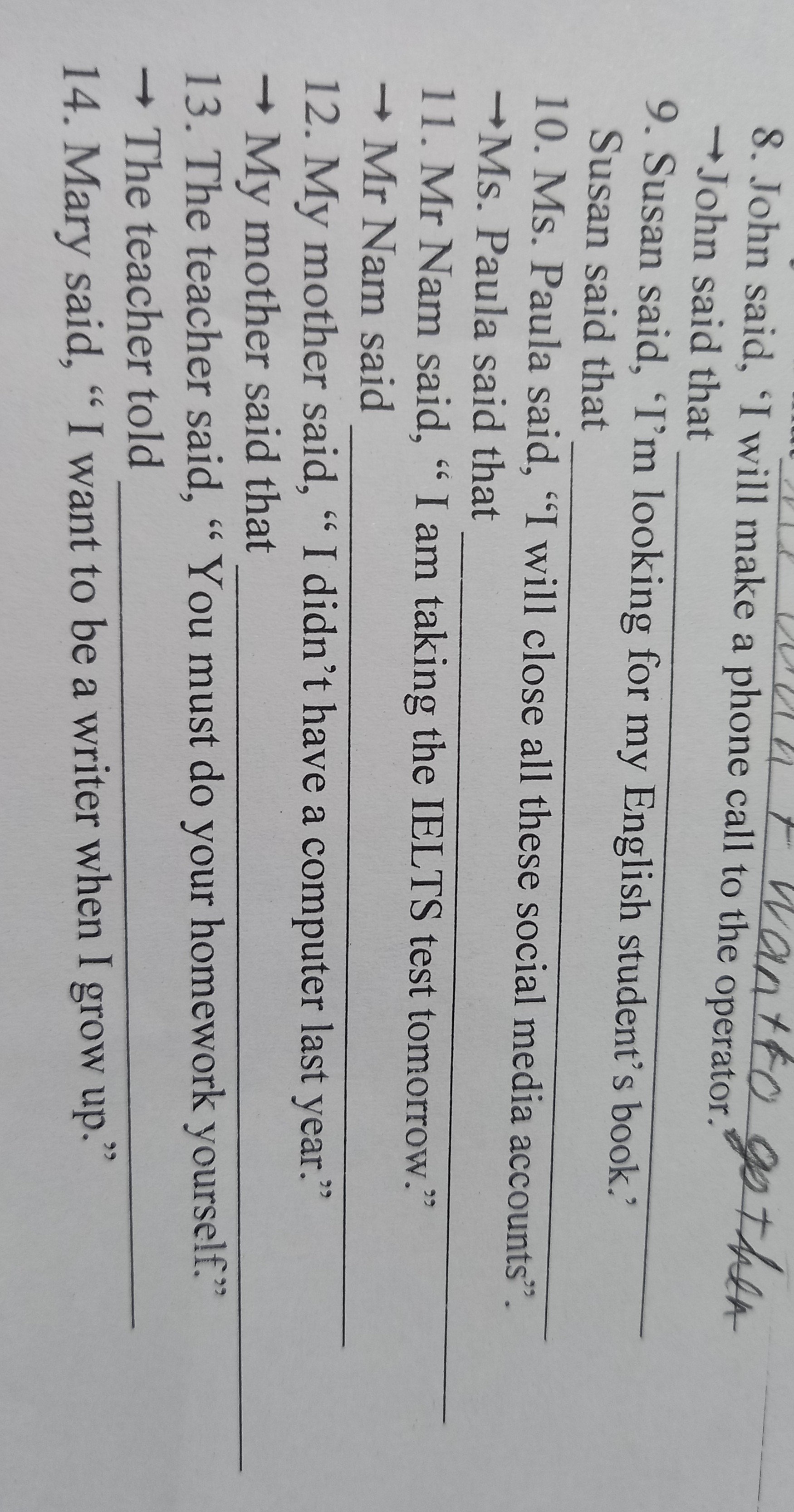 11. Anh Nam nói rằng anh ấy sẽ thi IELTS vào ngày hôm sau.