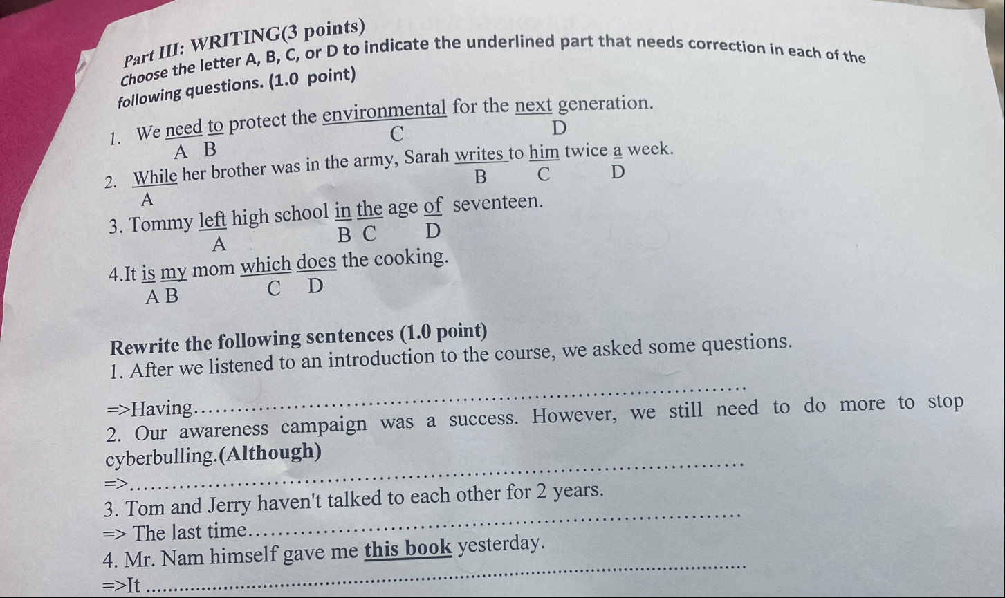 I hope these corrections and rewritten sentences are helpful! Let me know if you have any other questions or need further assistance with English writing exercises.
