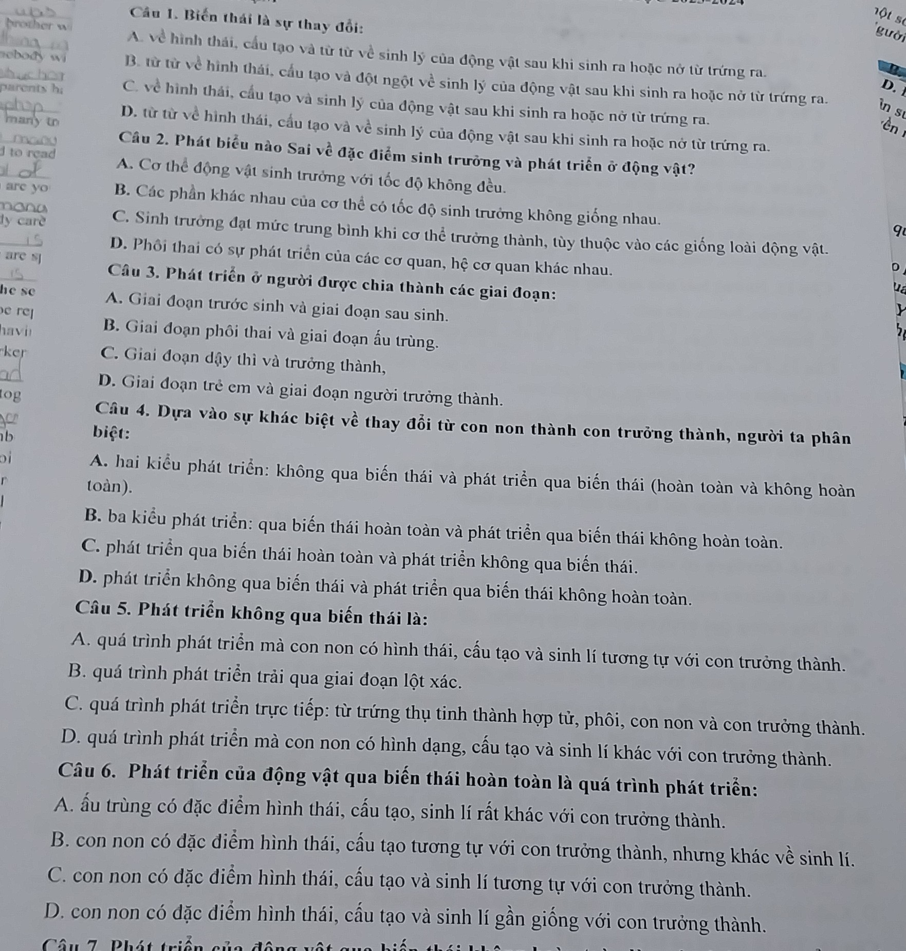 Câu 6: A. Phát triển của động vật qua biến thái hoàn toàn là quá trình phát triển mà ấu trùng có đặc điểm hình thái, cấu tạo, sinh lí rất khác với con trưởng thành.