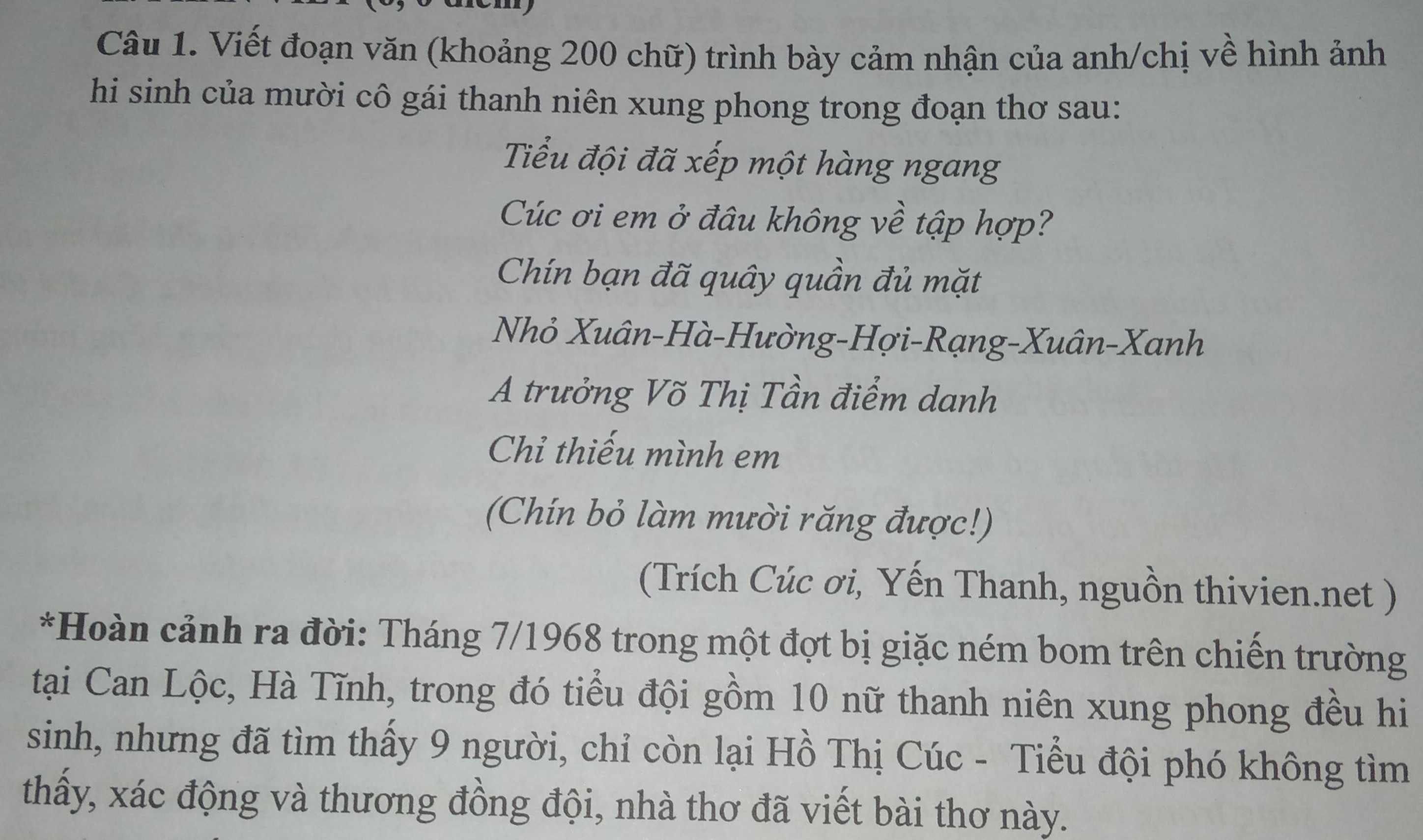 Bài thơ Cúc ơi của nhà thơ Yến Thanh chính là một tác phẩm như thế. Trang sách đã khép nhưng niềm day dứt, thương xót chị Cúc vẫn còn mãi trong lòng độc giả hôm nay. Tình yêu Tổ quốc luôn là khái niệm thiêng liêng và quý báu, nhất là với lớp trẻ. Khi Việt Nam chìm trong khói lửa, tuổi trẻ Việt Nam chính là lực lượng nòng cốt bảo vệ độc lập dân tộc. Đặc biệt, trong số đó có những nữ chiến sĩ chỉ mới mười tám, đôi mươi, đang mang trong mình rất nhiều ước mơ, hoài bão. Vậy mà những cô gái ấy với tình yêu đất nước bao la đã biến những ước mơ thành ý chí sắt đá để có thể bảo vệ tổ quốc khi kẻ thù xâm lược. Điển hình là mười nữ thanh niên xung phong trong cuộc kháng chiến chống Mỹ cứu nước. Sự hy sinh của các chị đã đi vào lịch sử dân tộc, tên của các chị đã hóa thành tên chung “Mười cô gái Ngã ba Đồng Lộc”. Khi các chị hy sinh, thi thể của Tiểu đội phó Hồ Thị Cúc được tìm thấy cuối cùng sau ba ngày ròng rã. Chính trong những ngày đen tối ấy, với niềm xót thương người em, người đồng đội, tác giả Yến Thanh đã viết bài thơ Cúc ơi nghẹn ngào, da diết. Nhà thơ Yến Thanh tên thật Nguyễn Thanh Bình, khi đó là cán bộ kỹ thuật ngành giao thông, trực tiếp làm việc tại núi bom Đồng Lộc. Đặc biệt, nhà thơ còn là người anh, người đồng đội rất thân thiết với chị Hồ Thị Cúc. Trong những năm tháng chống Mỹ cứu nước, ngã ba Đồng Lộc là trọng điểm hết sức ác liệt, hố bom chồng lên hố bom, không còn một cành cây, ngọn cỏ. Một ngày tháng 7 năm 1968, mười cô gái Tiểu đội Bốn do Võ Thị Tần làm tiểu đội trưởng được lệnh ra mặt đường để lấp hố bom do máy bay Mỹ vừa trút xuống. Đó là nhiệm vụ quen thuộc của các chị, vì ở đây không biết mấy trăm lần, ban ngày quân địch phá tan đường, cuối ngày thanh niên xung phong lại nối liền đường để đoàn xe lăn bánh vào Nam. Thế nhưng vào cái ngày định mệnh ấy, những trận bom của giặc Mỹ đã đồng bộ đổ xuống khi các chị đang làm nhiệm vụ, vùi lấp mười cô gái. Sau một thời gian, thi thể chín người đã được tìm thấy duy chỉ một người cuối cùng là chị Hồ Thị Cúc vẫn bặt vô âm tín. Đau đớn xót xa tận cùng, bốn câu thơ đầu như lời gọi của nhà thơ dành cho chị Cúc: “Tiểu đội đã về xếp một hàng ngang/Cúc ơi! Em ở đâu không về tập hợp/Chín bạn đã quây quần đủ mặt/Nhỏ - Xuân – Hà – Hường – Hợi – Rạng – Xuân – Xanh”. Hẳn là đau đớn lắm, xót xa lắm nên Yến Thanh mới nhớ mãi cảnh chị Tần điểm danh đồng đội mà cho đến khi thi thể các chị xếp cạnh nhau, tác giả vẫn tưởng họ đang tập hợp. Yến Thanh đã nhắc tới một câu thành ngữ quen thuộc nhưng lại khẳng định câu thành ngữ ấy không thể dùng trong hoàn cảnh này “Chín bỏ làm mười”, là thành ngữ chỉ sự phiên phiến, làm tròn. Nhưng ở đây, mười cô gái hy sinh mới tìm được chín thi thể, không thể “phiên phiến” được. Tiếng khóc quặn thắt, buốt nghẹn, nức nở. Những câu thơ mộc mạc mà cứa lòng, cứa da độc giả. Đáng lẽ khi chưa tìm được chị Cúc, các đồng đội phải nôn nóng, nhát cuốc càng nhanh, càng mạnh. Thế nhưng ở đây, các anh chỉ “bới tìm vẹt cuốc” vì sợ chị Cúc đau, sợ em xương tan thịt nát. Thế mới thấy tình đồng đội là bài ca đẹp nhất, còn mãi giá trị qua thời gian. Cúc chỉ mười tám, đôi mươi nhưng để tìm chị, đồng đội phải dùng đến “đũa găm, cơm úp”. Hình ảnh ấy như dấu chấm hết cho một kiếp người dang dở, bao khát khao chưa thành hiện thực. Gọi em chưa đủ, nỗi thê lương đã hóa thành tiếng “Gào em”, mong muốn Cúc hãy nghe thấy và trở về. Bài thơ với câu chữ bình dị, mộc mạc nhưng làm độc giả lay động vì tình cảm tác giả dành cho chị Cúc cùng các chị thanh niên xung phong tròn đầy trong từng câu, từng chữ. Cái sống – cái chết mong manh là vậy nhưng các nữ chiến sĩ vẫn lạc quan sống, thương yêu Tổ quốc, chiến đấu vì độc lập dân tộc, trở thành những bông hoa đẹp nhất, khắc trên trang sử vàng của đất nước ta. Cúc ơi đã cho ta “biến đi khỏi thế giới” với hàng trăm ngàn mặt người mệt mỏi, lo toan, để ta “tìm lại được thế giới” sâu trong tâm tư mình. Đọc về những cô gái thanh niên xung phong ngày hôm qua để tìm thấy đam mê, nhiệt huyết của mình ngày hôm nay, nhận thức rõ nhiệm vụ của mình với quê hương, đất nước. Mỗi lần đọc sách là một lần ta có cơ hội “còn lại một mình với cả thế giới trong lòng bàn tay”. Tóm lại, Cúc ơi với giọng thơ nghẹn ngào đã thể hiện niềm thương xót của tác giả nói riêng, của đồng bào ta nói chung đối với sự hy sinh của những cô gái thanh niên xung phong, đặc biệt là chị Hồ Thị Cúc. Để ngày hôm nay, nhìn lại ta càng cố gắng phấn đấu, viết tiếp bản trường ca của các chị, xây dựng đất nước thịnh vượng, giữ gìn hòa bình