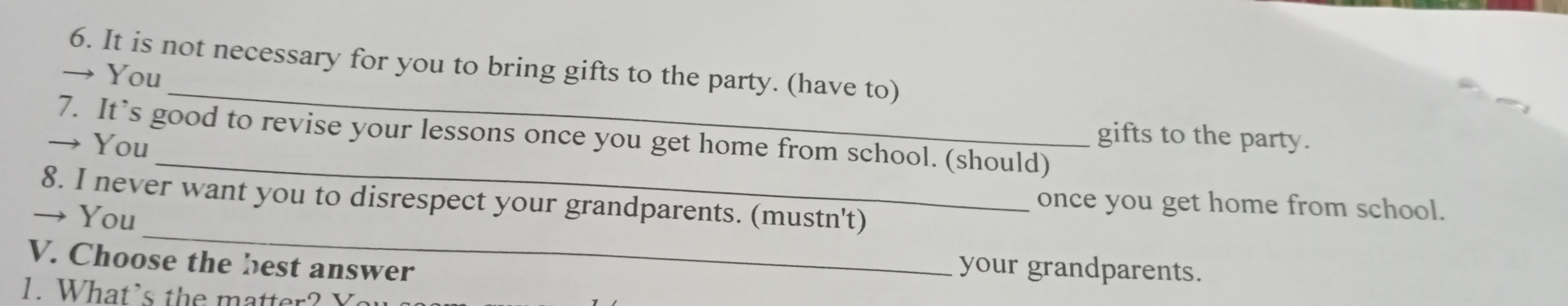 6. It is not necessary for you to bring gifts to the party. (have to)