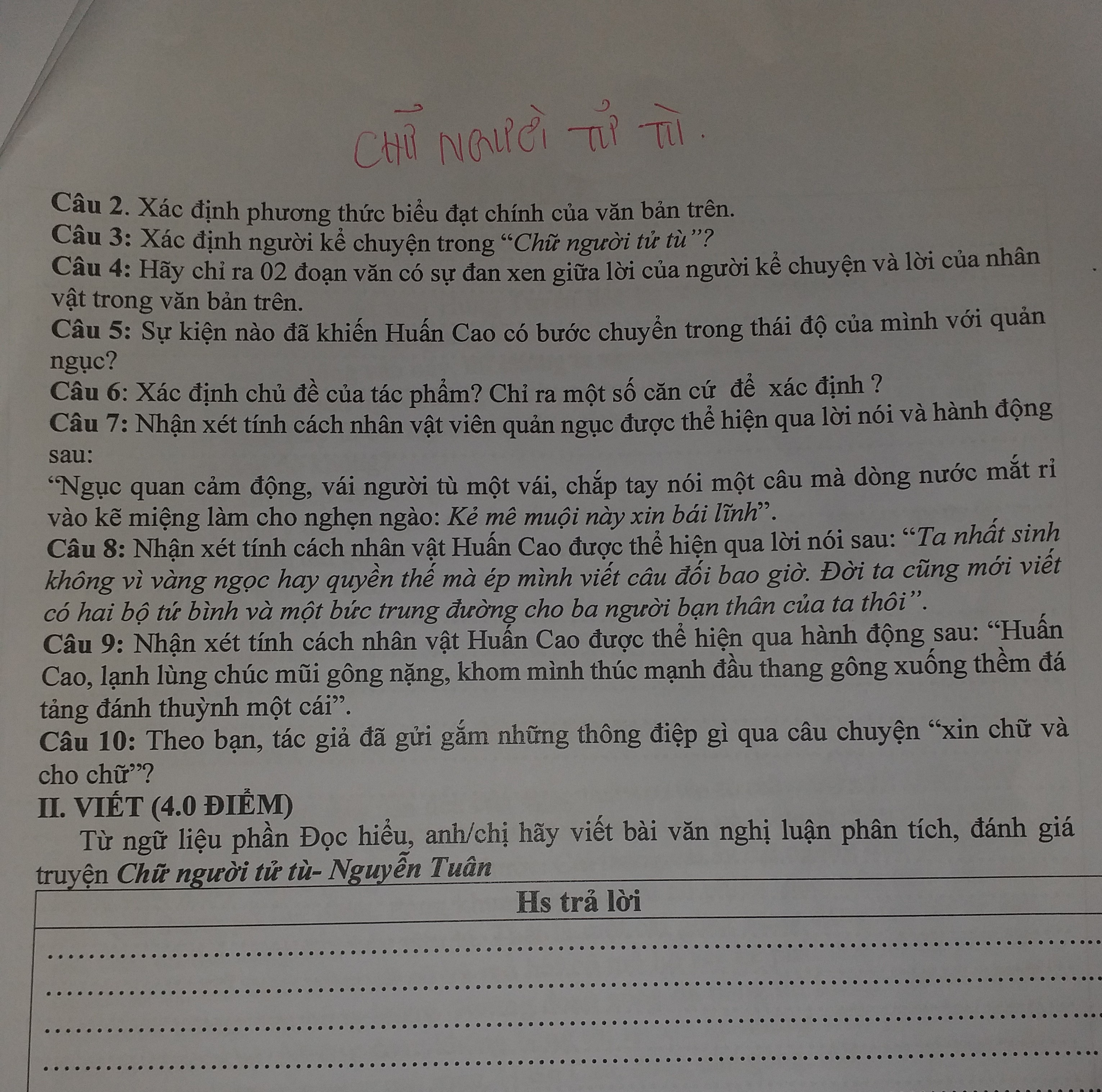 Vào một đêm hoang vắng, tại trại giam tỉnh Sơn đã xảy ra “một cảnh tượng xưa nay chưa từng có”. Trong buồng giam tăm tối, chật hẹp, mùi ẩm mốc bốc lên, xung quanh là đầy nhưng mạng nhện giăng, mùi hôi thối của phân chuột, phân gián. Trong không khí khói tỏa, ngọn lửa đỏ rực của ngọn đuốc đang cháy hừng hực. “Một người tù, cổ đeo gông, chân vướng xiềng, đang đậm tô nét chữ trên tấm lụa trắng tinh”, viên quản ngục “khúm núm”, thầy thơ lại “run run bưng chậu mực”, vị thế nhân vật dường như đổi dời người nắm quyền thế bỗng dưng khép nép, kính cẩn trước một tử tù. Cái đẹp không lẻ loi đơn độc, nó không tồn tại cùng cái xấu xa mà chiến thắng chúng, nhân đạo hoá những tâm hồn đang vướng bụi trần giúp họ thức tỉnh, tìm lại con người nhân nghĩa vốn có của mình.