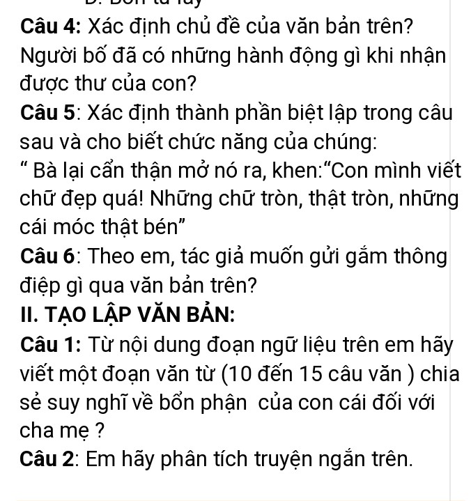 Khi người vợ hỏi ông tại sao lại không nhờ người đọc hộ bức thư, ông liền bảo rằng: “Nó là con tôi, nó viết gì tôi biết cả”. Có thể thấy, ông như một người bạn đồng hành của con, tôn trọng quyền riêng tư và độc lập của con. Ông không muốn người khác đọc bức thư của con gửi, vì ông hiểu con hơn bao giờ hết, hiểu con qua từng con chữ giản đơn. Những lá thứ được ông giữ một cách cẩn thận, ngắm nhìn nó từng ngày “những lá thư được bóc ra nhìn ngắm, chạm vào mặt rồi cất đi, không thiếu một lá, ngay cả những lá thư đầu tiên nét chữ còn non nớt”.