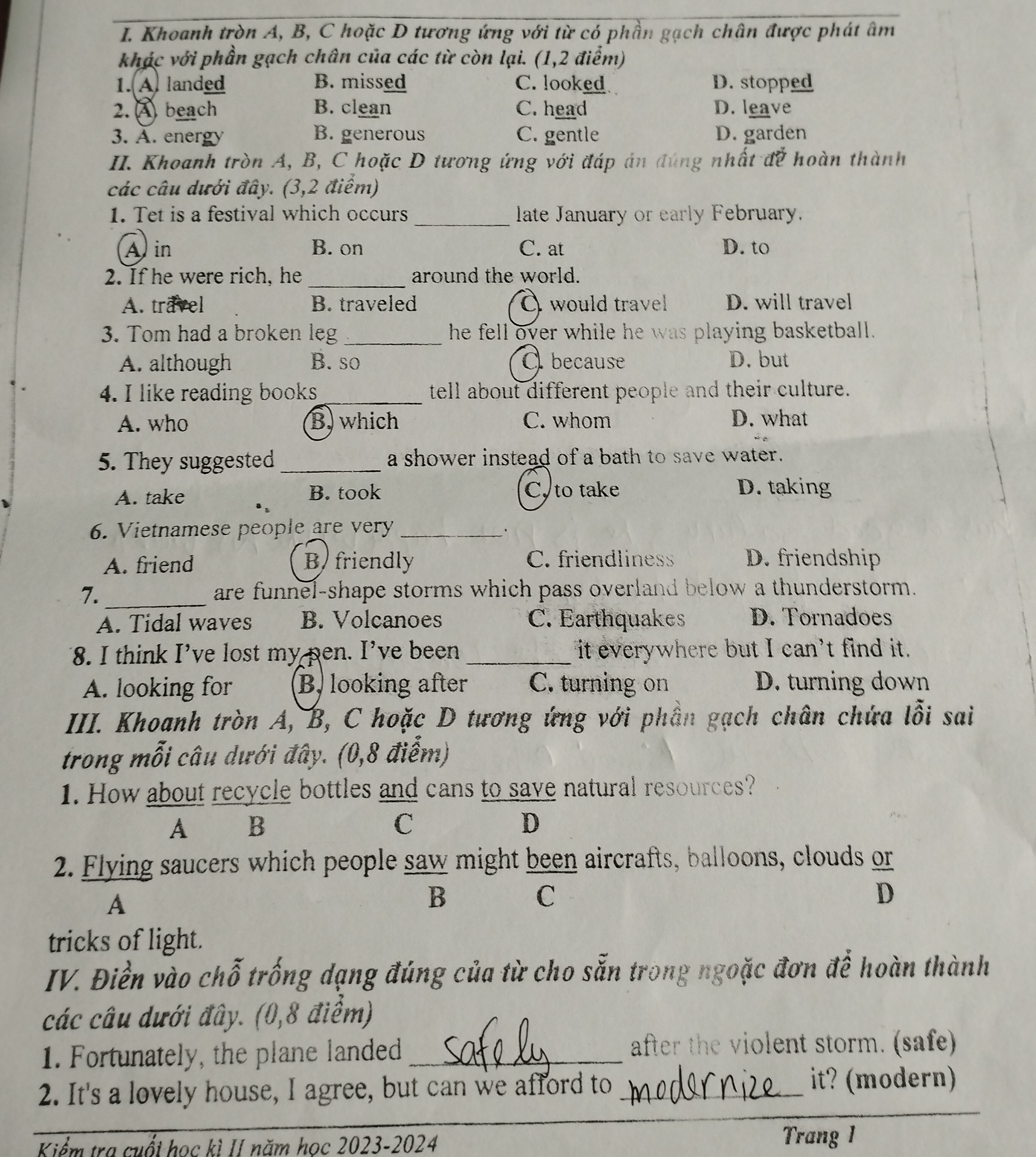 1. May mắn thay, máy bay đã hạ cánh **an toàn** sau cơn bão dữ dội.