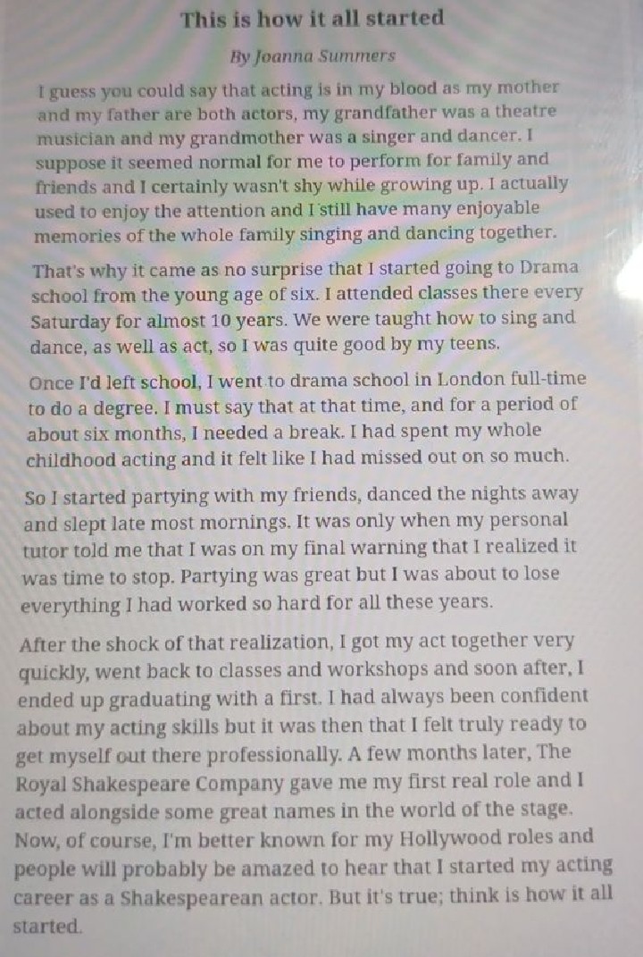 Có thể nói rằng diễn xuất là một phần của máu trong tôi vì cả mẹ và bố tôi đều là diễn viên, ông nội của tôi là một nhạc sĩ sân khấu và bà nội tôi là một ca sĩ và vũ công. Tôi đoán rằng việc biểu diễn trước gia đình và bạn bè có vẻ là chuyện bình thường và khi tôi lớn lên, tôi chắc chắn không hề ngần ngại. Thực ra, tôi từng thích sự chú ý và tôi vẫn giữ trong lòng nhiều kỷ niệm vui vẻ khi cả gia đình cùng hát và nhảy múa cùng nhau. Đó là lý do tôi bắt đầu đi học trường Kịch từ khi tôi mới sáu tuổi. Tôi đã tham gia các lớp học mỗi thứ bảy suốt gần 10 năm. Chúng tôi được dạy hát hò và nhảy múa, cũng như diễn xuất, vì vậy tôi khá giỏi khi ở tuổi teen của mình.