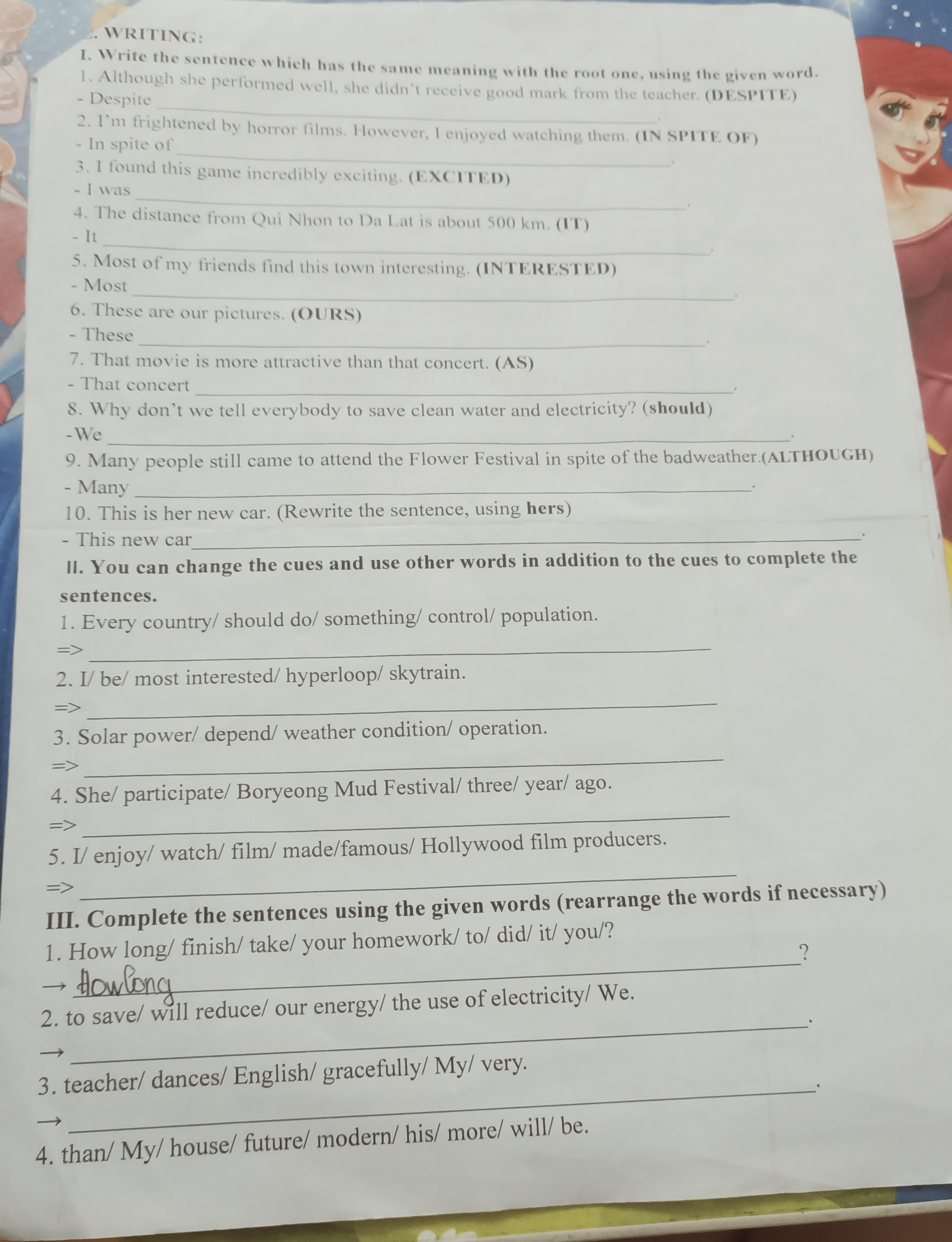 I. Write the sentence which has the same meaning with the root one, using the given word.