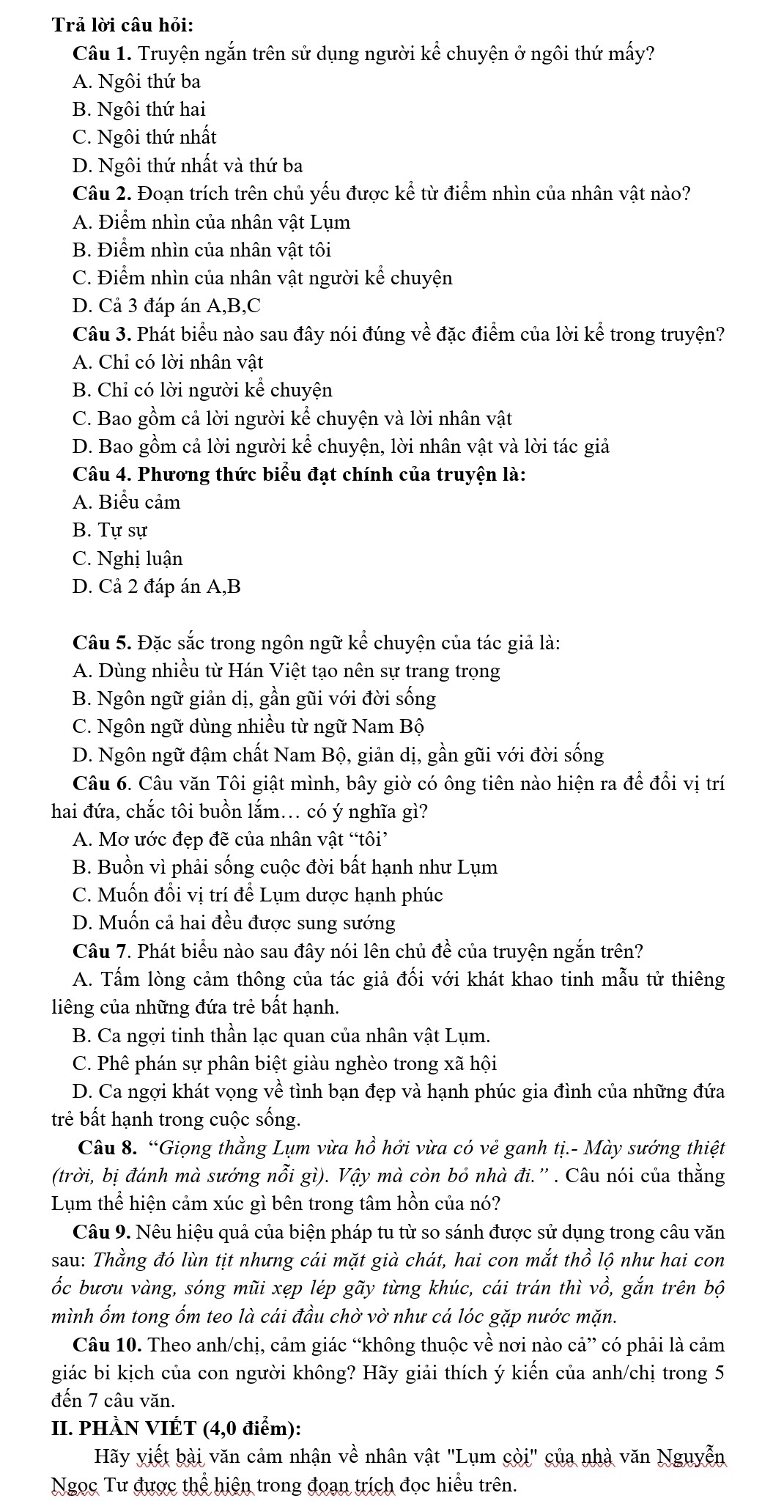 Câu 9. Biện pháp tu từ so sánh được sử dụng trong câu văn sau có hiệu quả trong việc tạo ra hình ảnh dễ hình dung về ngoại hình Lụm