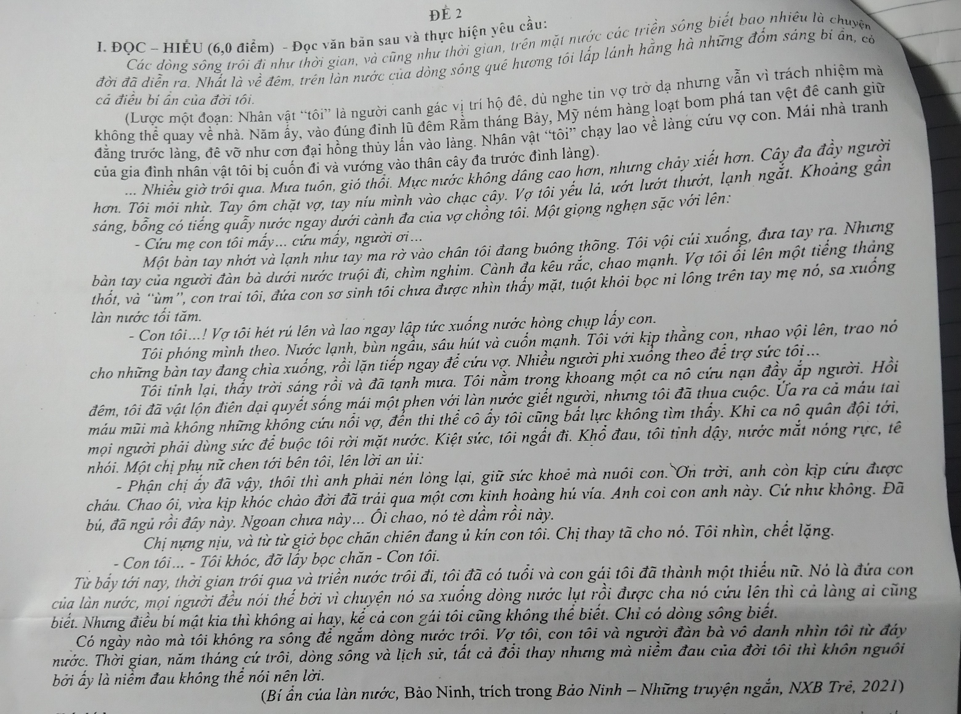 + Điểm nhìn: truyện được kể từ góc nhìn của nhân vật chính , một người đàn ông trải qua bi kịch mất vợ trong một trận lũ lụt . Anh ta là người trực tiếp chứng kiến và trải qua những sự kiện , tạo nên một cái nhìn chân thực và đầy xúc động