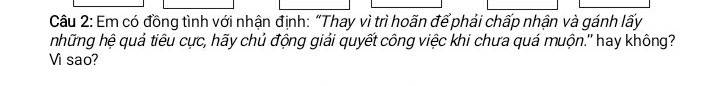 Tóm lại, quyết định có đồng tình hay không với nhận định trên phụ thuộc vào hoàn cảnh cụ thể và tính chất công việc của mỗi người. Việc chủ động giải quyết công việc thường mang lại nhiều lợi ích hơn là trì hoãn, nhưng đôi khi cũng cần phải cân nhắc kỹ lưỡng trước khi ra quyết định.