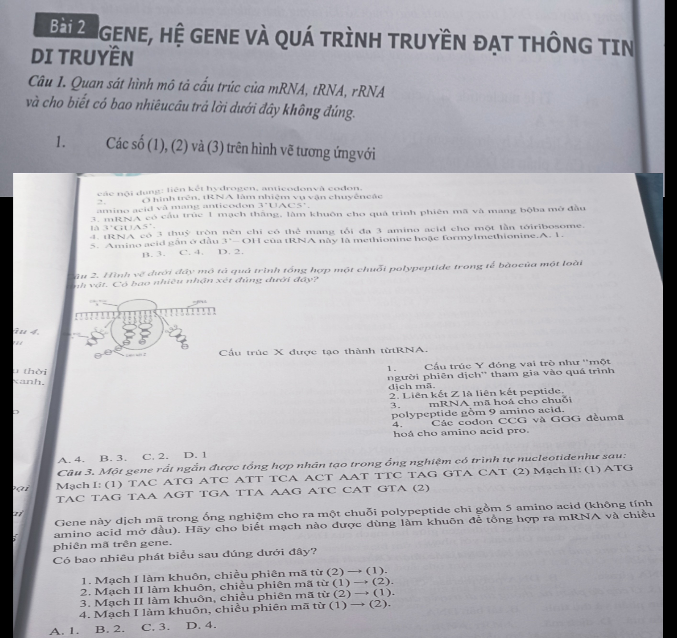 1. Các số (1), (2) và (3) trên hình vẽ tương ứng với các nội dung: liên kết hydrogen, anticodon và cođon. (Câu này đúng)