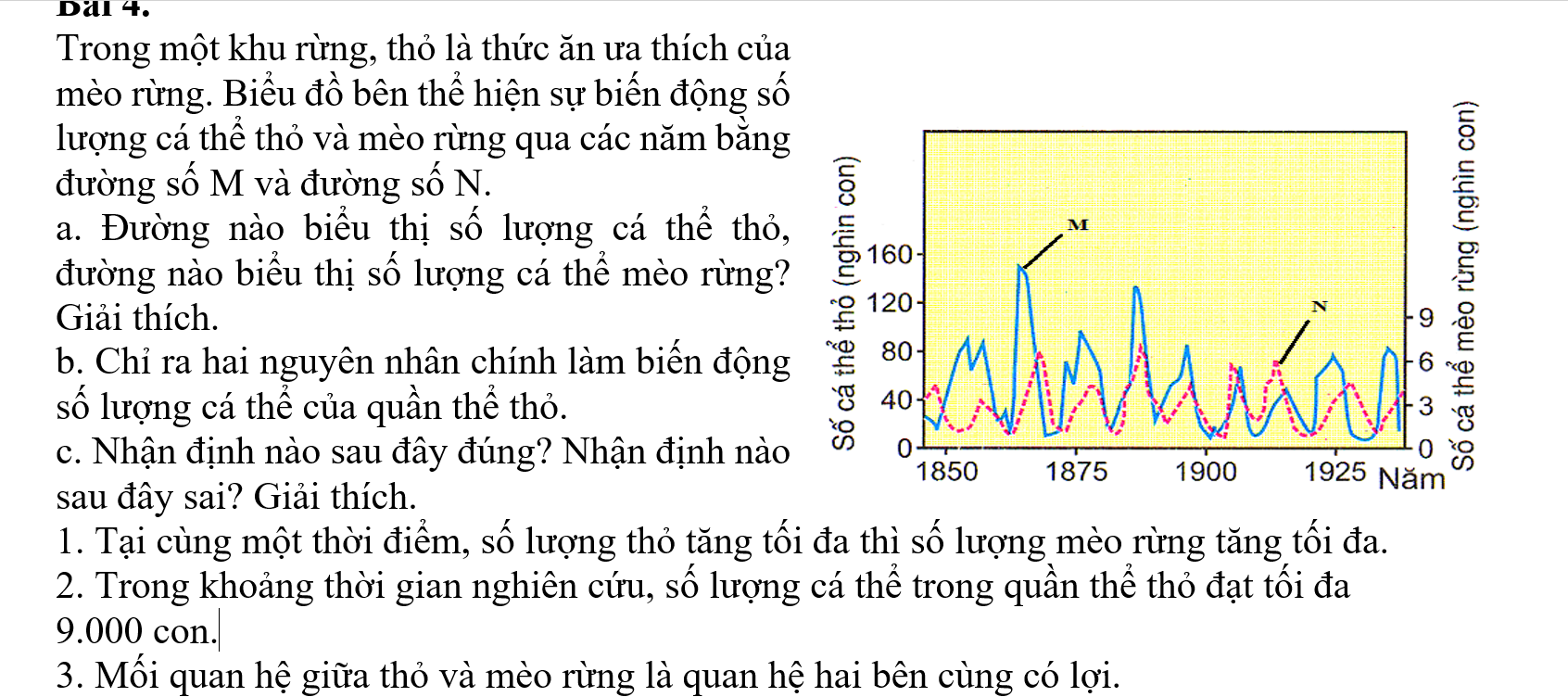 Giải thích: Khi số lượng thỏ tăng tối đa, nguồn thức ăn dồi dào, mèo rừng sẽ sinh sản mạnh và số lượng tăng lên. Tuy nhiên, số lượng mèo rừng sẽ tăng sau một thời gian, không đồng thời với thời điểm số lượng thỏ tăng tối đa.
