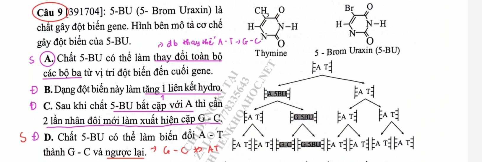 A: sai .Vì $5BU$ chỉ gây đột biến thay thế nu mà không ảnh hưởng tới số lượng bộ ba