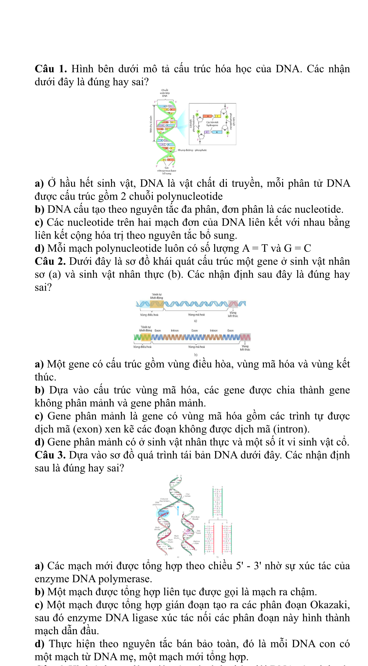 Hồng Duyên câu 1: a) Ở hầu hết sinh vật, DNA là vật chất di truyền, mỗi phân tử DNA được cấu trúc gồm 2 chuỗi polynucleotide: ĐÚNG. Đây là đặc điểm cơ bản của cấu trúc DNA. Hai chuỗi polynucleotide xoắn quanh nhau tạo thành cấu trúc xoắn kép đặc trưng.