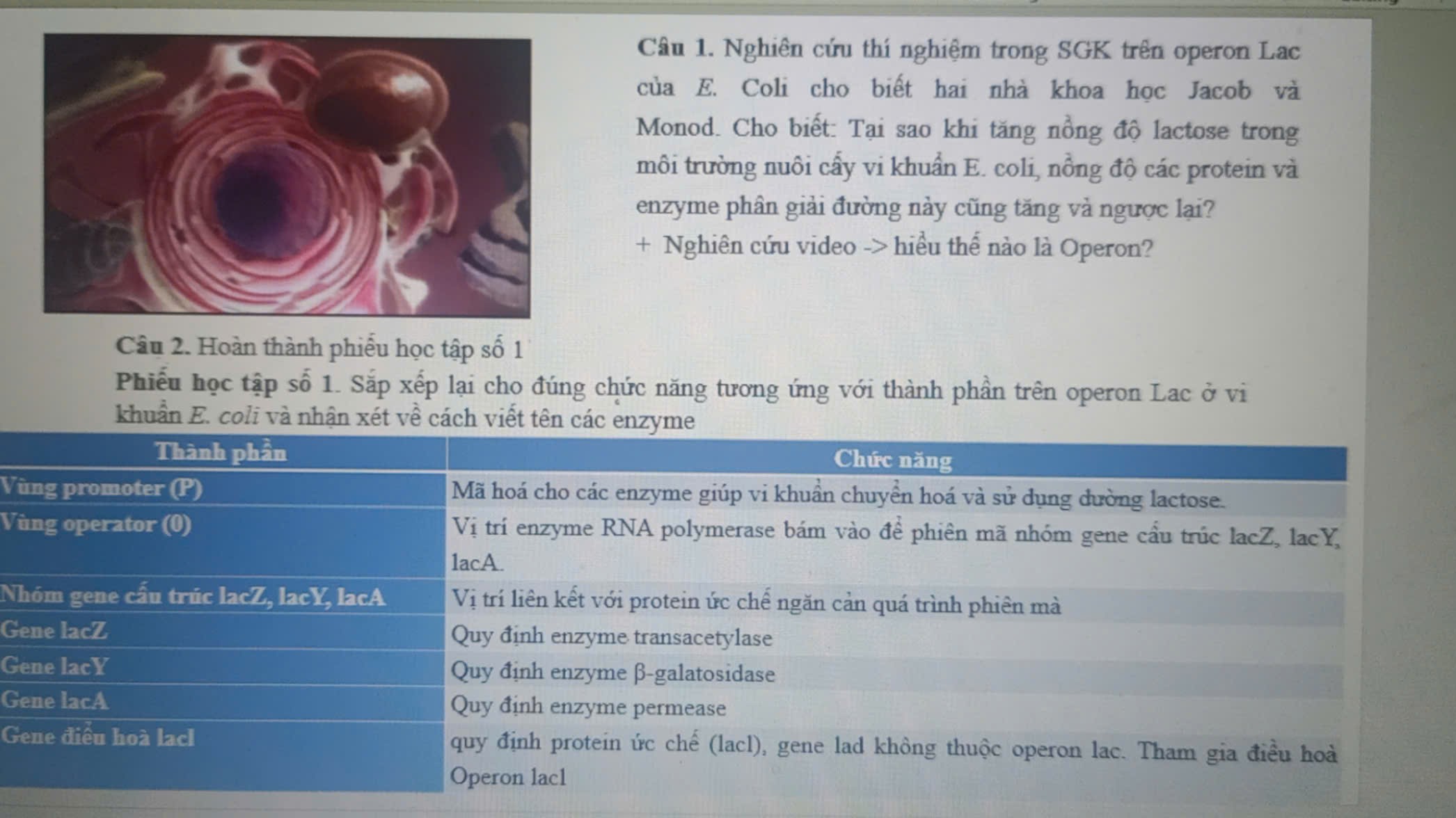 Câu 1: Khi nồng độ lactose trong môi trường nuôi cấy vi khuẩn E. coli tăng, nồng độ các protein và enzyme phân giải đường này cũng tăng do lactose là chất cảm ứng cho operon Lac. Khi lactose có mặt, nó sẽ liên kết với protein ức chế, làm cho protein này không còn khả năng ngăn cản quá trình phiên mã. Kết quả là các gene cấu trúc lacZ, lacY, và lacA được phiên mã, dẫn đến sự sản xuất các enzyme cần thiết để phân giải lactose. Ngược lại, khi nồng độ lactose giảm, protein ức chế sẽ quay trở lại và ngăn cản quá trình phiên mã, làm giảm nồng độ các enzyme này.