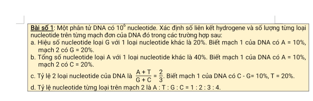 Cho một phân tử DNA có 10^10 nucleotide. Yêu cầu xác định số liên kết hydrogene và số lượng từng loại nucleotide trên từng mạch đơn của DNA trong các trường hợp khác nhau.