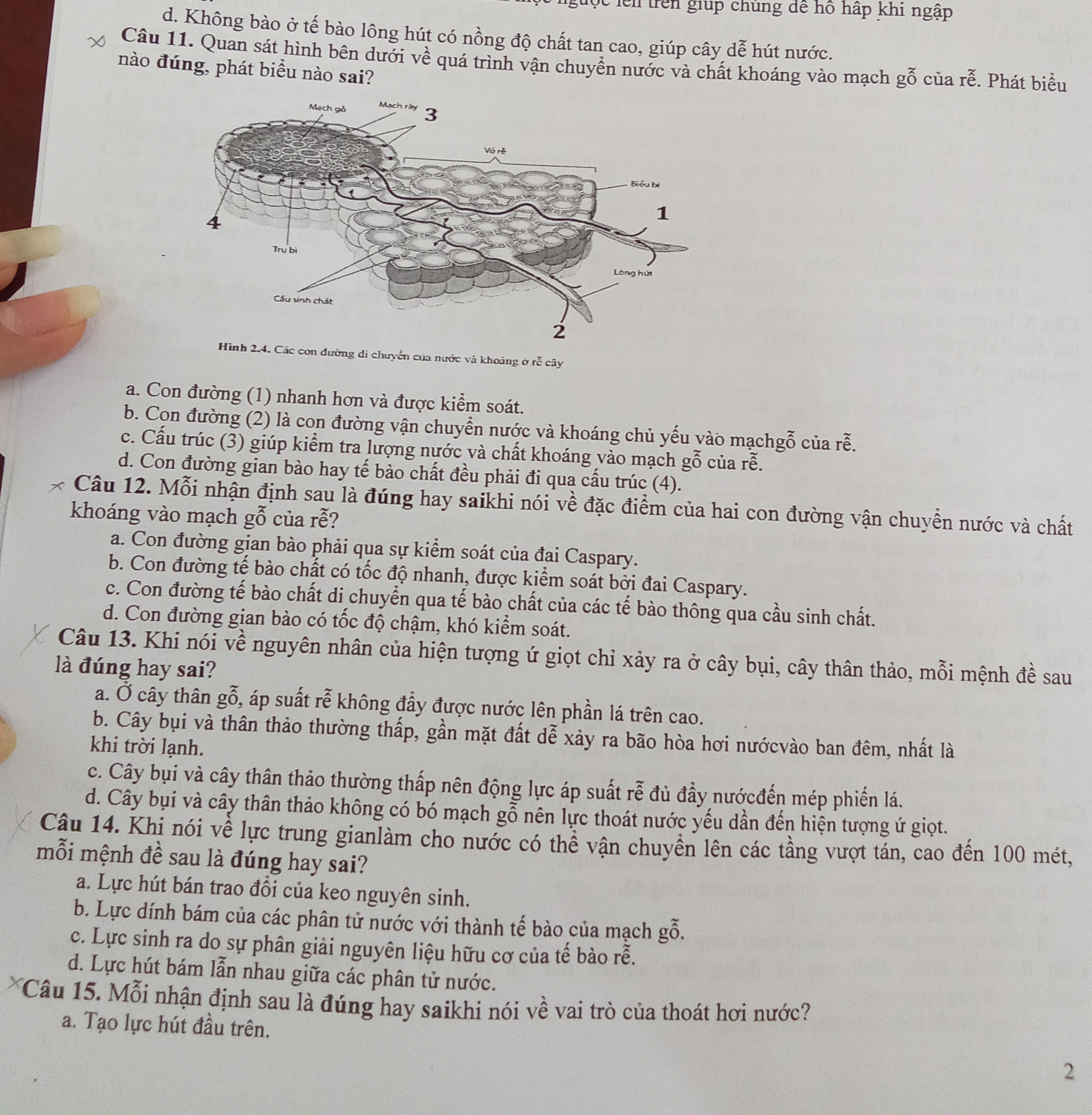 b. Đúng - Con đường (2) là con đường gian bào, là con đường vận chuyển nước và khoáng chủ yếu vào mạch gỗ của rễ.