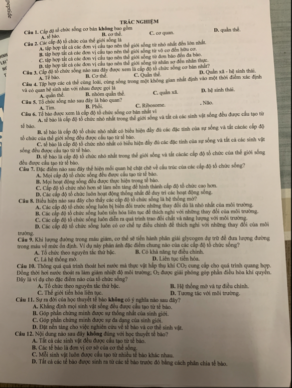 Câu 1: Cấp độ tổ chức sống cơ bản không bao gồm