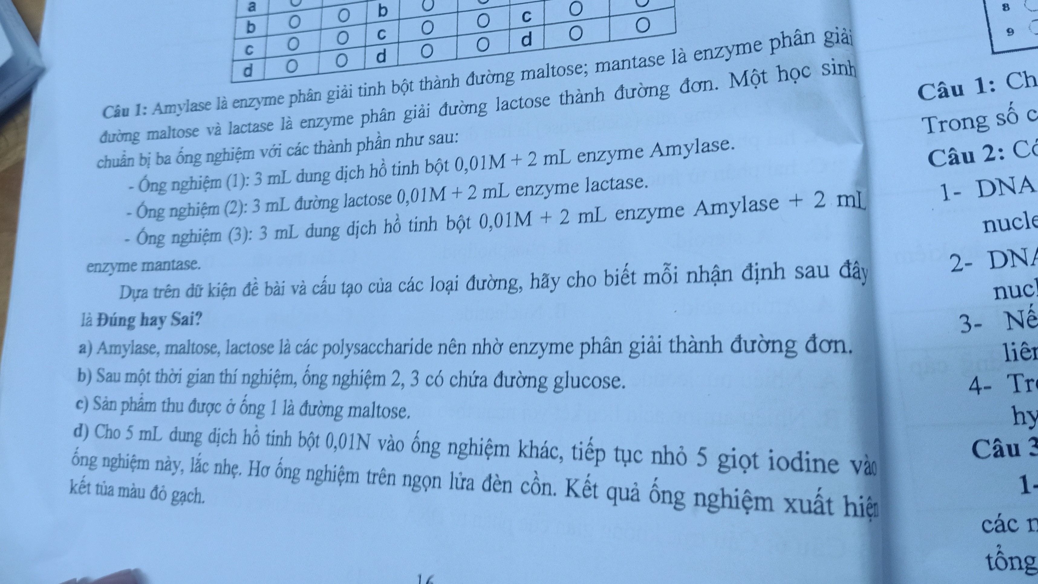 **Đúng.** Ống nghiệm 2 có enzyme lactase sẽ phân giải lactose thành glucose và galactose. Ống nghiệm 3 có enzyme amylase và maltase, enzyme amylase sẽ phân giải tinh bột thành maltose, sau đó enzyme maltase sẽ phân giải maltose thành glucose.