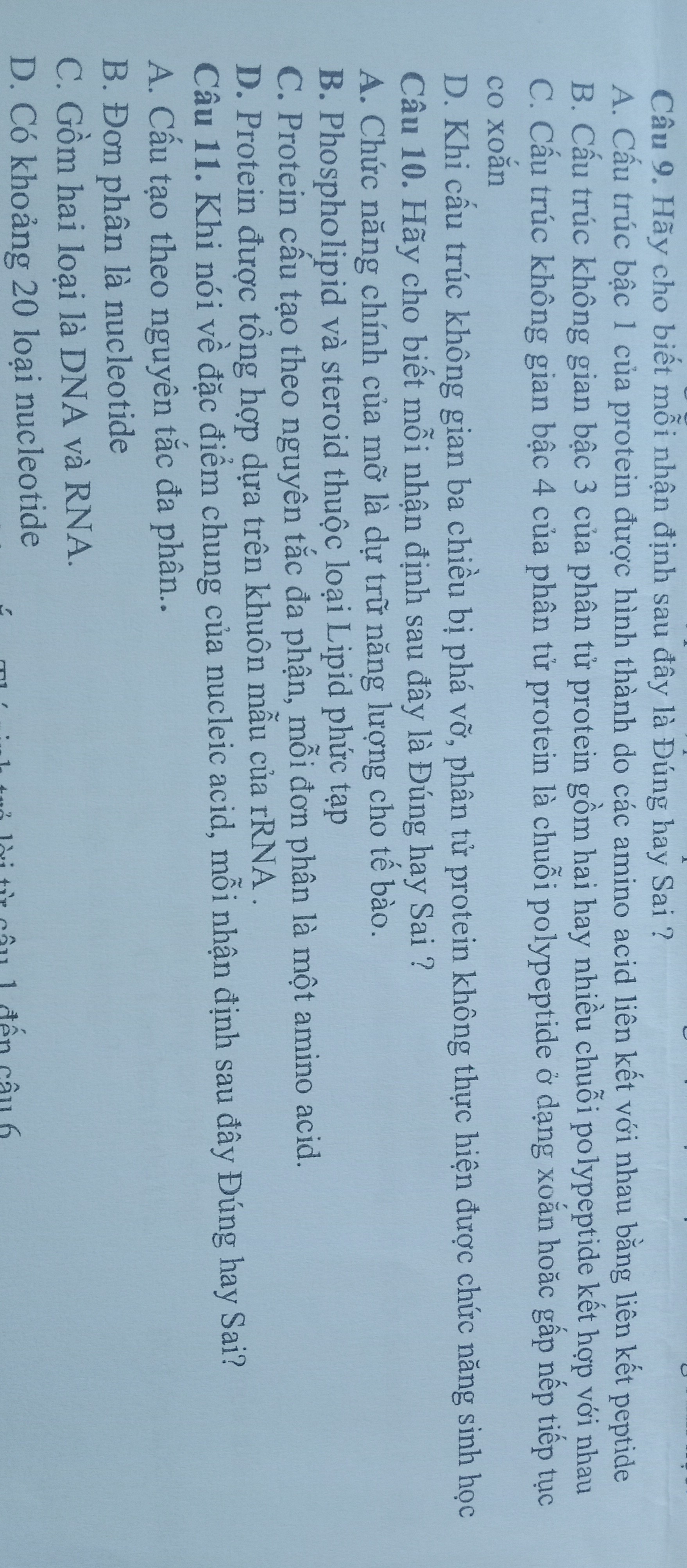 B. Sai. Cấu trúc không gian bậc 3 của phân tử protein là hình dạng không gian ba chiều của chuỗi polypeptide cuộn gập hoàn chỉnh, không phải là sự kết hợp của hai hay nhiều chuỗi polypeptide.