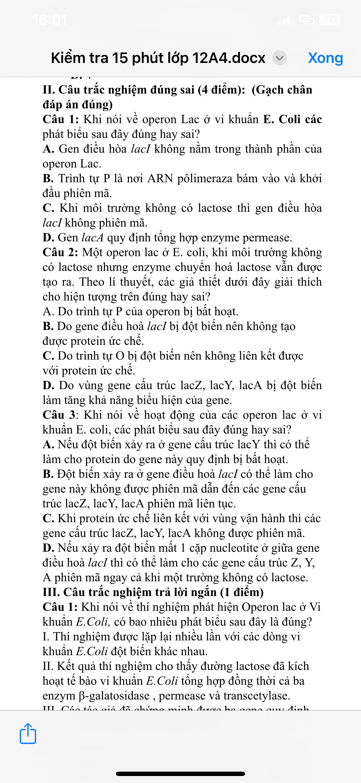 Câu 1: Khi nói về operon Lac ở vi khuẩn E. Coli các phát biểu sau đây đúng hay sai?