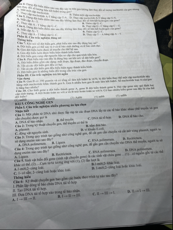 Tuyệt vời! Bạn đã đưa ra một bộ câu hỏi rất hay về đột biến gen và công nghệ gen. Dưới đây là lời giải chi tiết cho từng câu hỏi, kèm theo những giải thích rõ ràng để bạn dễ dàng hiểu hơn: