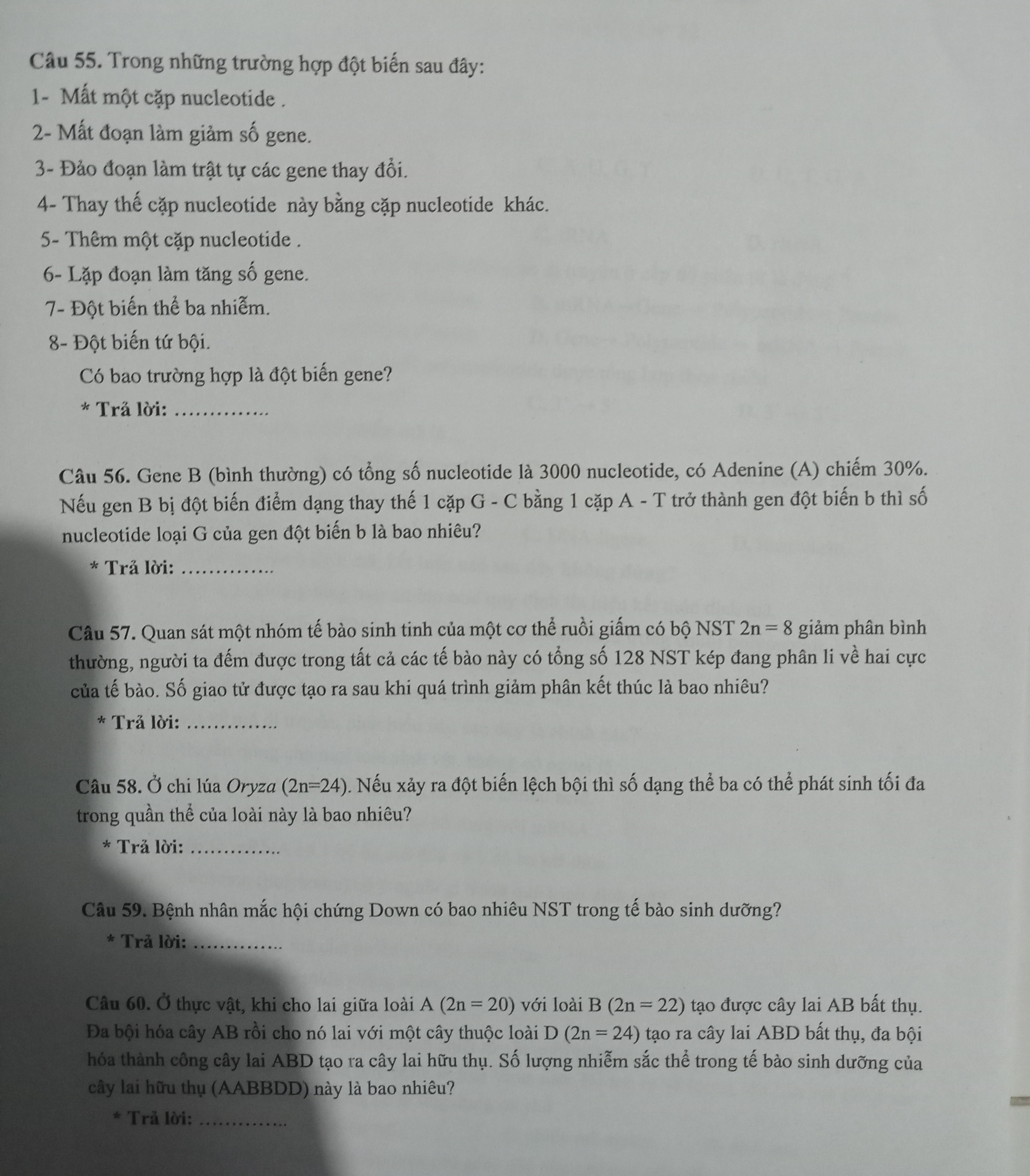 Các câu hỏi bạn đưa ra đều liên quan đến các khái niệm cơ bản và ứng dụng của di truyền học. Việc hiểu rõ các dạng đột biến, cơ chế di truyền và các phép lai sẽ giúp bạn giải quyết tốt các bài tập liên quan.