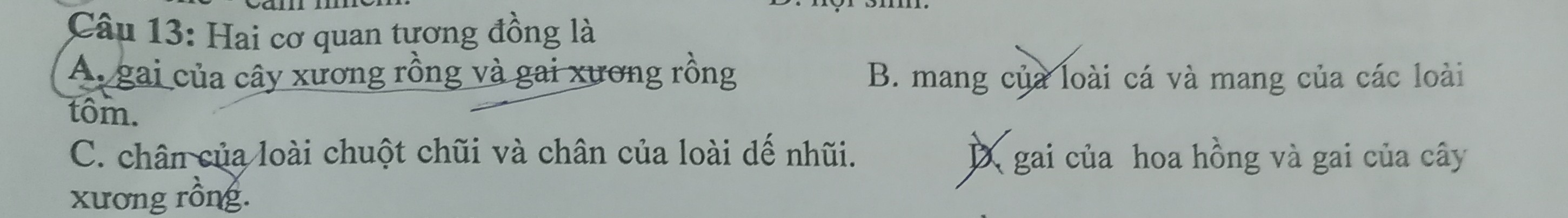 câu B. Mang của loài cá và mang của các loài tôm: Mang là cơ quan hô hấp dưới nước. Mặc dù cả cá và tôm đều có mang để trao đổi khí dưới nước, nhưng cấu trúc và nguồn gốc phát triển của mang ở động vật có xương sống (như cá) và động vật giáp xác (như tôm) là khác nhau. Do đó, chúng không phải là cơ quan tương đồng.