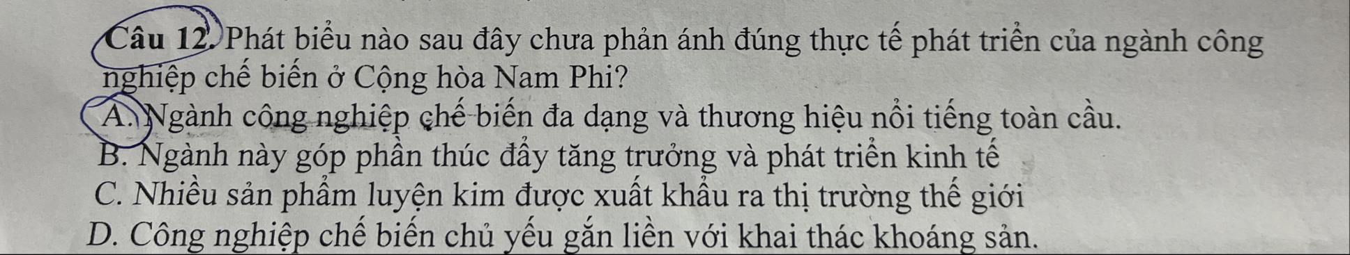 Mặc dù thông tin có nói rằng ngành công nghiệp chế biến ở Nam Phi có sự đa dạng, nhưng không có đề cập nào về việc các thương hiệu nổi tiếng toàn cầu liên quan đến ngành này. Các ngành công nghiệp chế biến ở Nam Phi chủ yếu liên quan đến khai thác khoáng sản, luyện kim, và các lĩnh vực khác nhưng không nhất thiết phải có thương hiệu nổi tiếng toàn cầu. Các phát biểu B, C và D đều phản ánh đúng thực tế phát triển của ngành công nghiệp chế biến ở Cộng hòa Nam Phi.