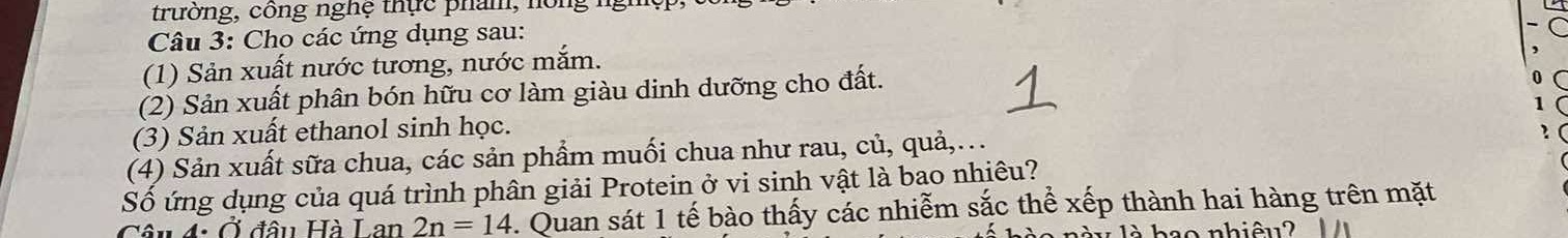 – Câu 3: Quá trình phân giải protein ở vi sinh vật có ứng dụng trong sản xuất nước tương, nước mắm (1) và sản xuất phân bón hữu cơ (2). Vậy số ứng dụng là 2.
