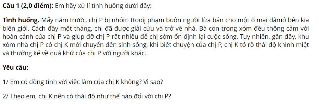 + Chị P là nạn nhân của hoạt động mua bán người. Việc chị K tỏ thái kì thị, phân biệt đối xử với chị P sẽ làm tăng nỗi đau, sự tổn thương tinh thần của chị P.