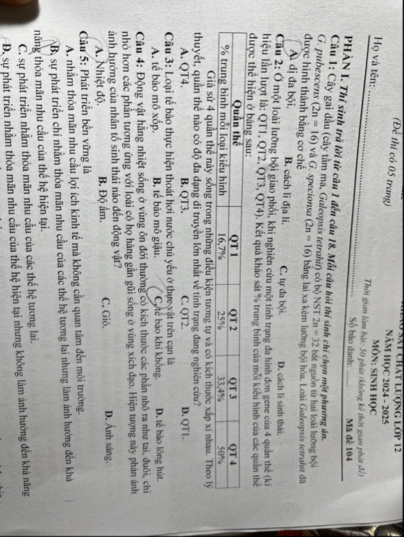 \(2. D\). QT1 có % kiểu hình thấp nhất, cho thấy sự cân bằng giữa các alen → đa dạng di truyền cao nhất.