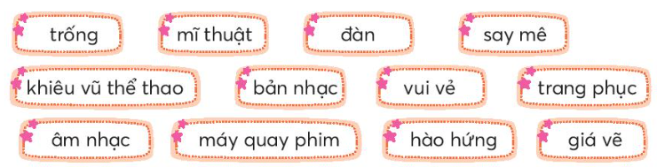 Xếp các từ ngữ dưới đây vào nhóm thích hợp: ![]() a. Chỉ môn nghệ thuật b. Chỉ dụng cụ khi tham gia hoạt động nghệ thuật c. Chỉ cảm xúc khi tham gia hoạt động nghệ thuật |