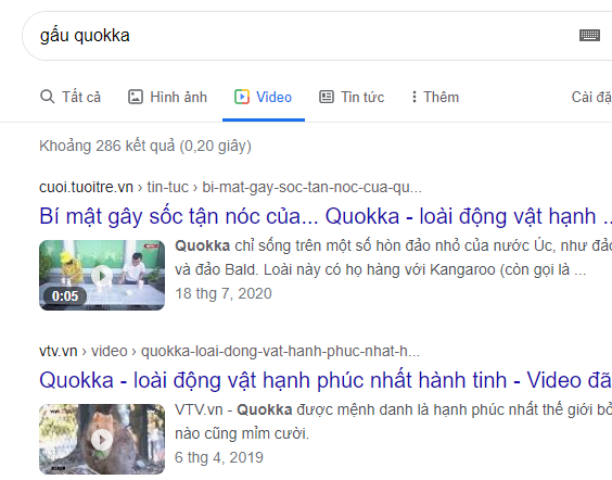 Tương tự nếu muốn tìm kiếm video thì sau khi ra được màn hình kết quả tìm kiếm, nháy vào mục Video để lọc thông tin là video. Kết quả như sau: