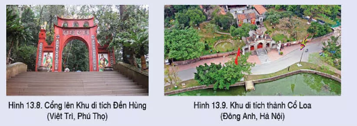 Dựa vào hình 13.8, hình 13.9 và các thông tin em tìm hiểu được, hãy đóng vai là một hướng dẫn viên du lịch để giới thiệu về khu di tích Đền Hùng và Khu di tích thành Cổ Loa?