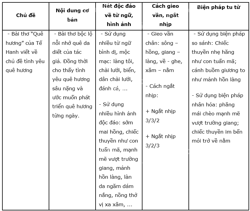 Tìm đọc và ghi vào nhật kí học tập một số bài thơ về tình yêu quê hương, đất nước dựa trên các nội dung sau: chủ đề, nội dung cơ bản, nét độc đáo về từ ngữ, hình ảnh, cách gieo vần, ngắt nhịp, biện pháp tu từ